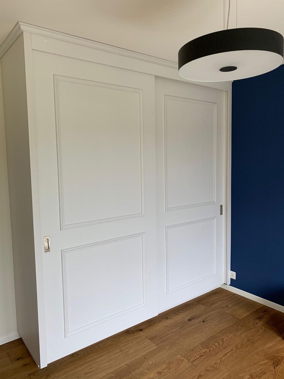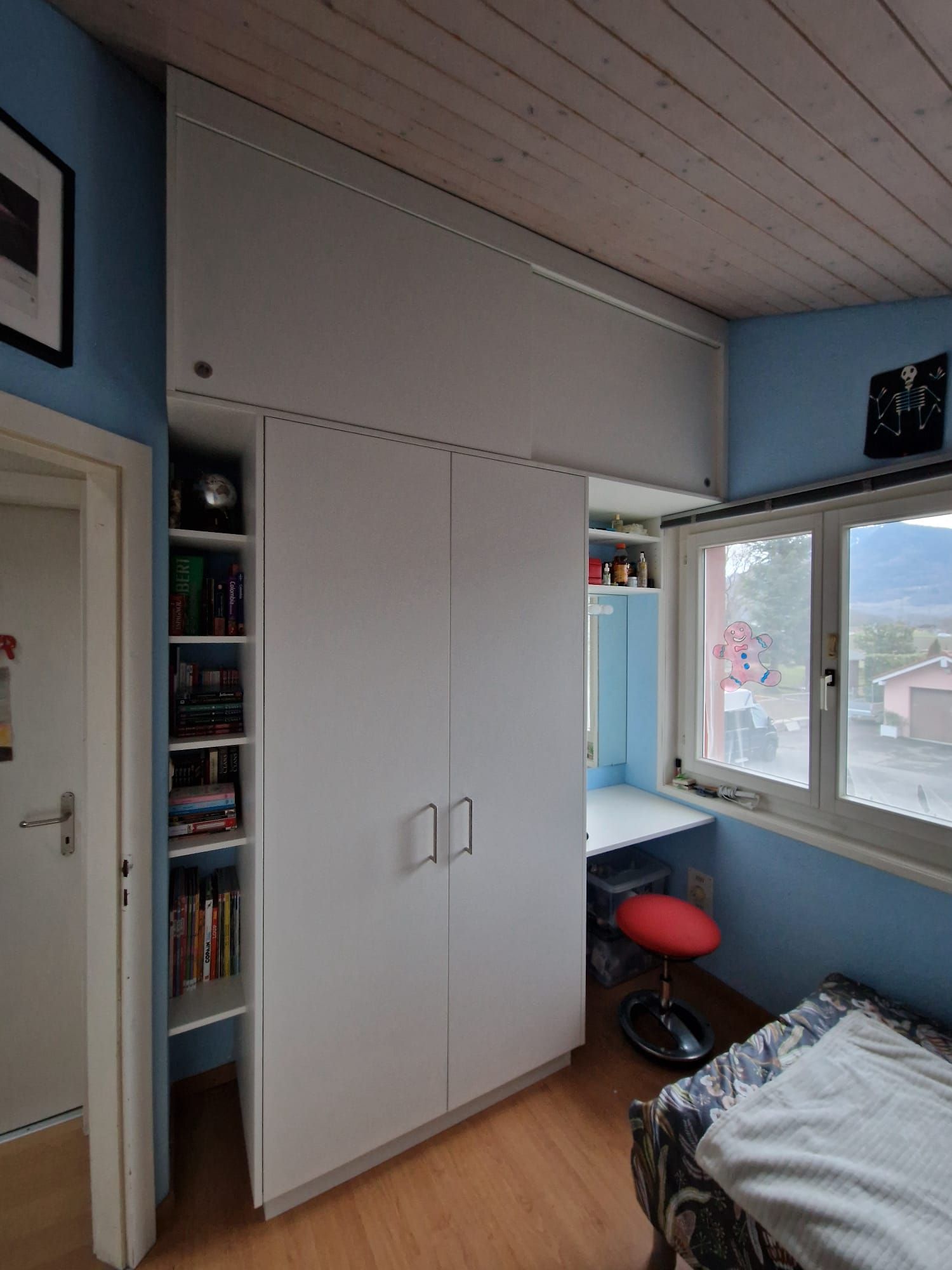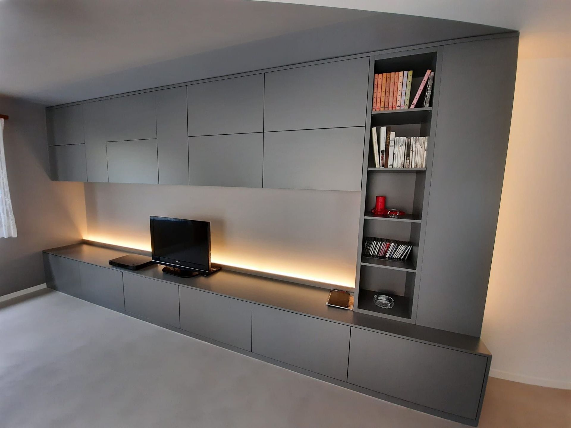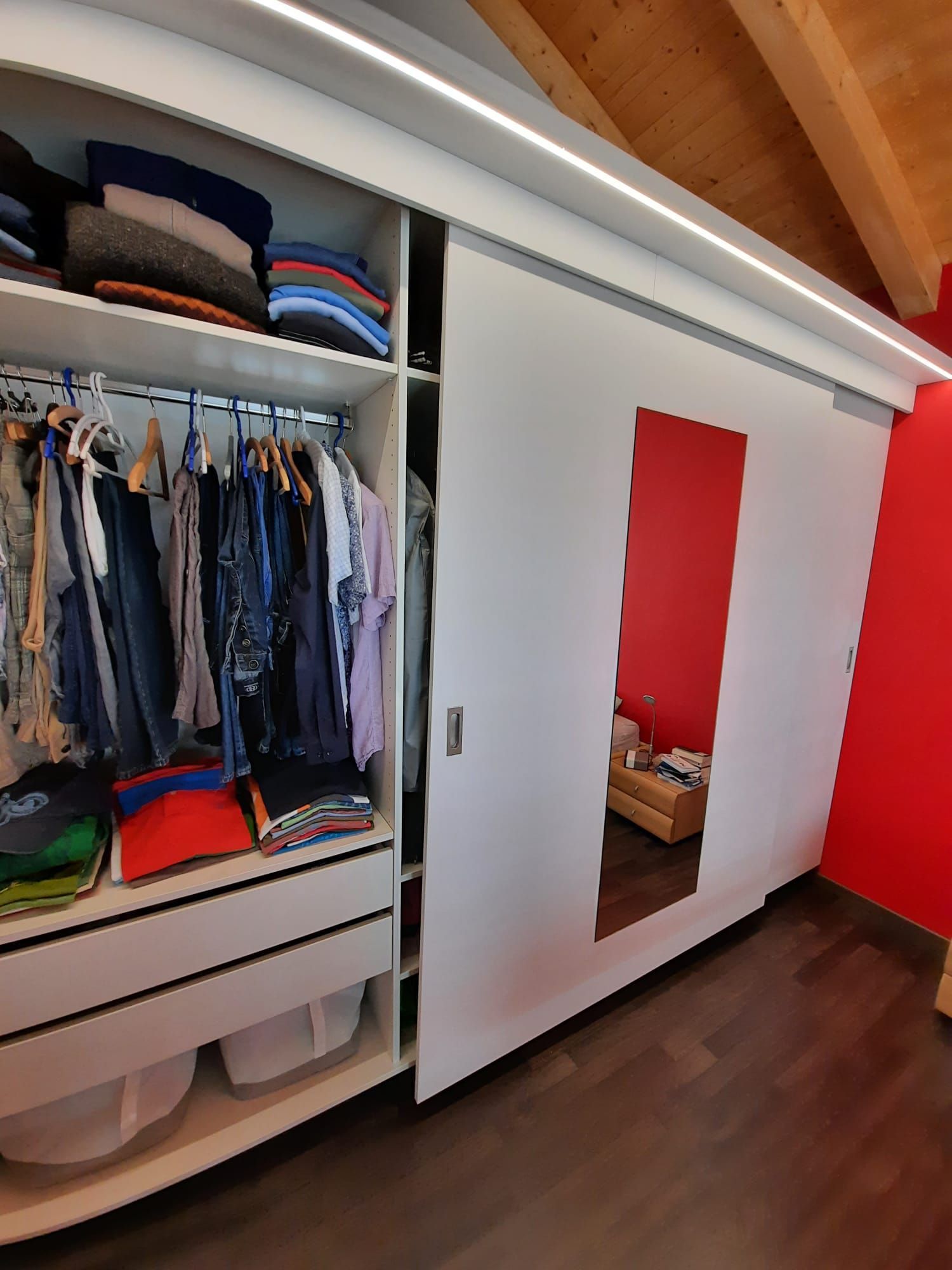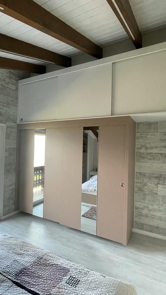 Armoires avec portes coulissantes en mélaminé avec éclairage intérieur, partie supérieure blanche adaptée pour y projeter un écran!
