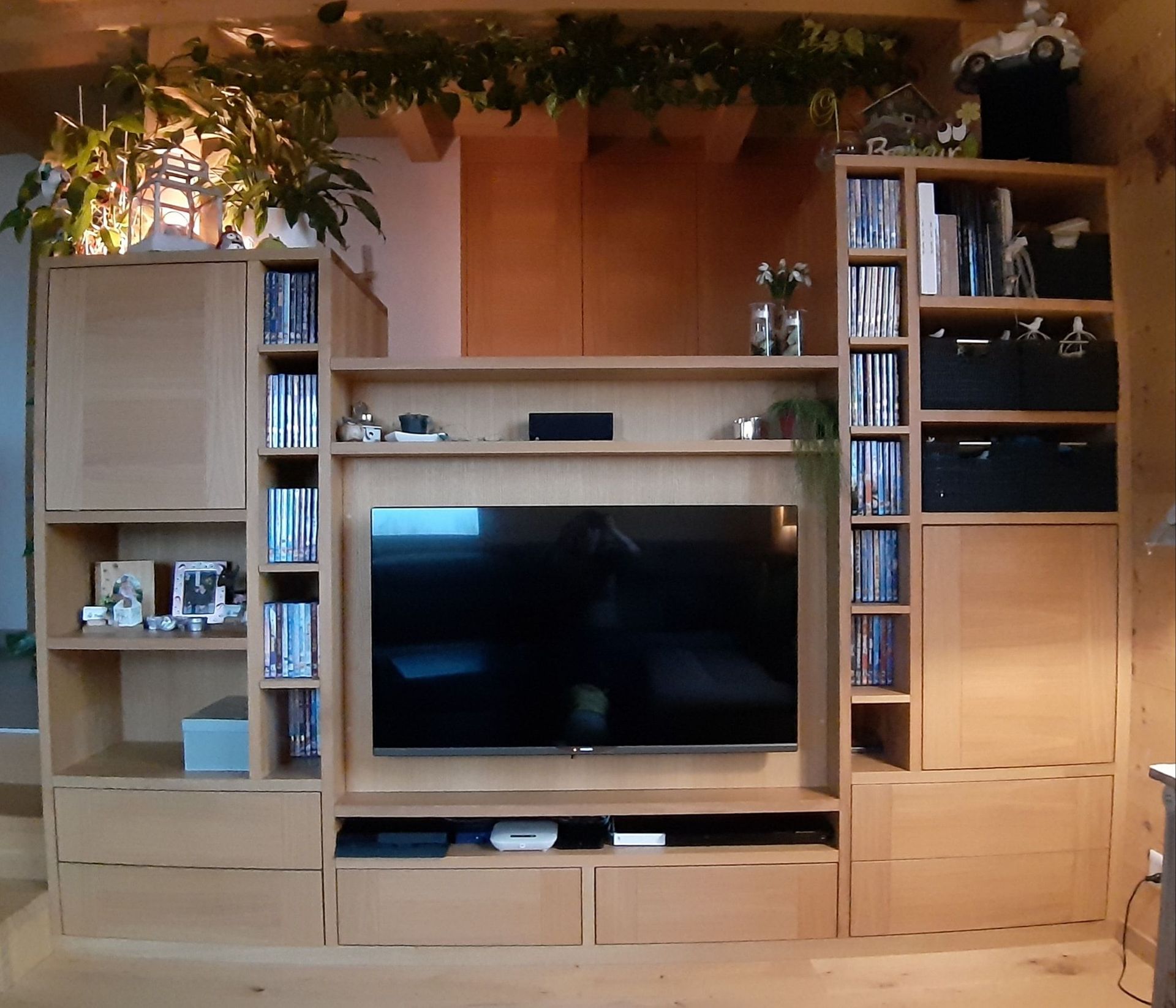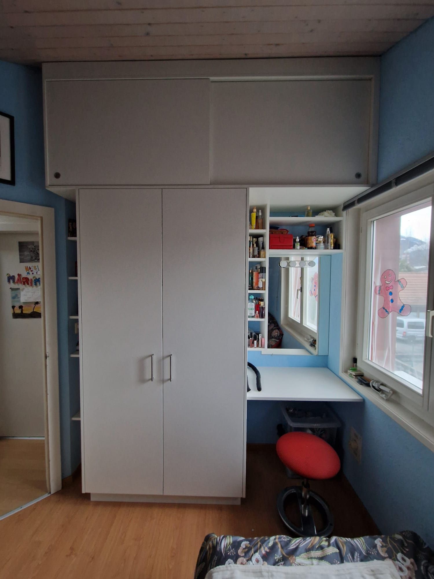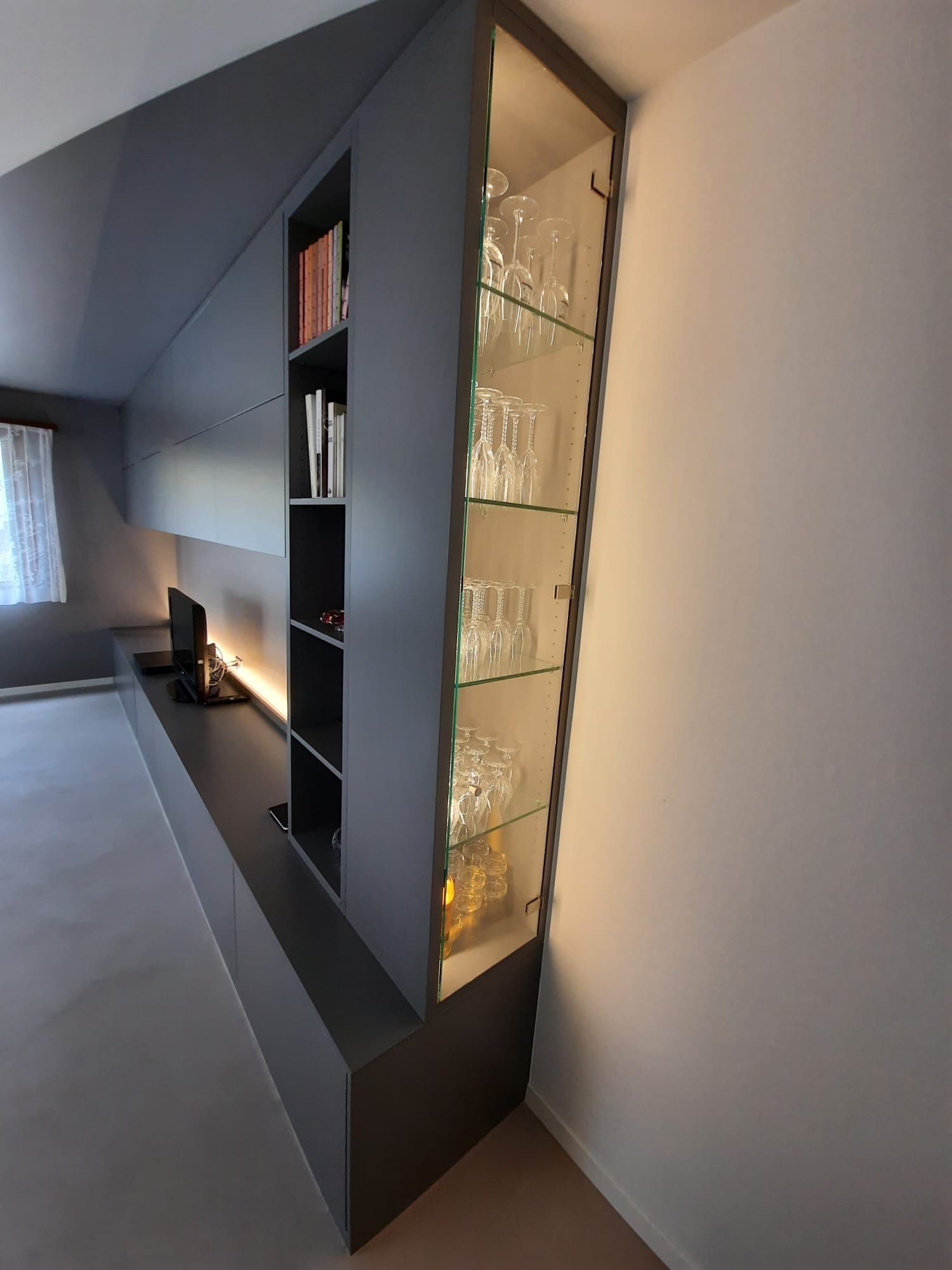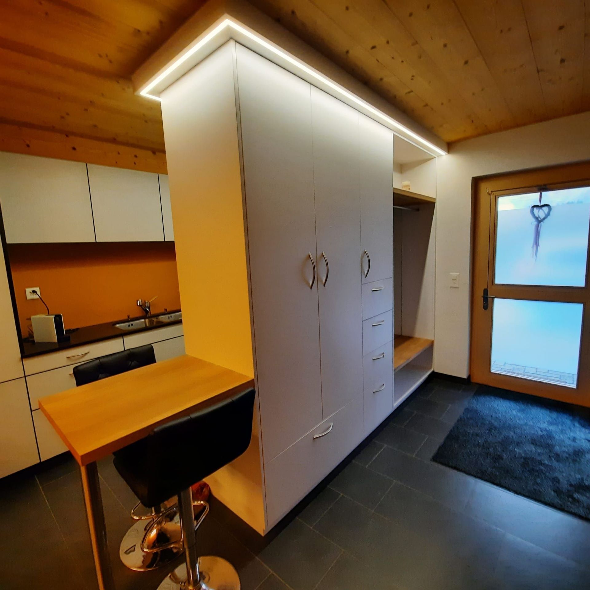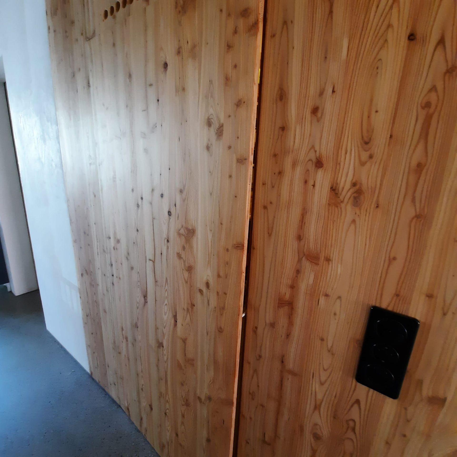 Armoires avec portes coulissantes en mélaminé avec éclairage intérieur, partie supérieure blanche adaptée pour y projeter un écran!