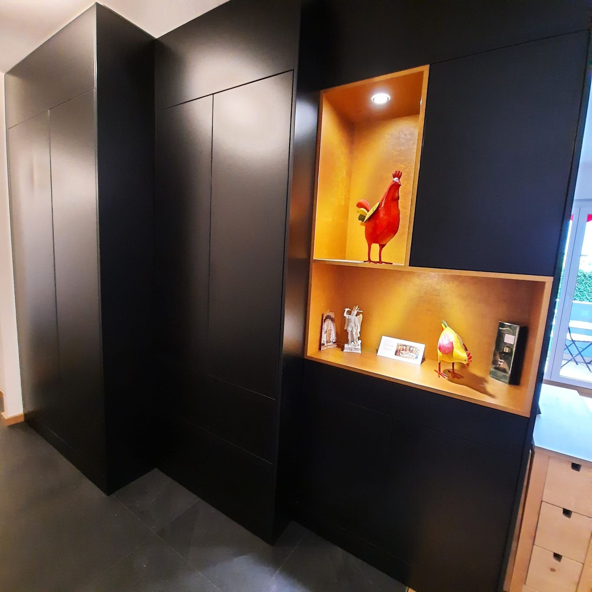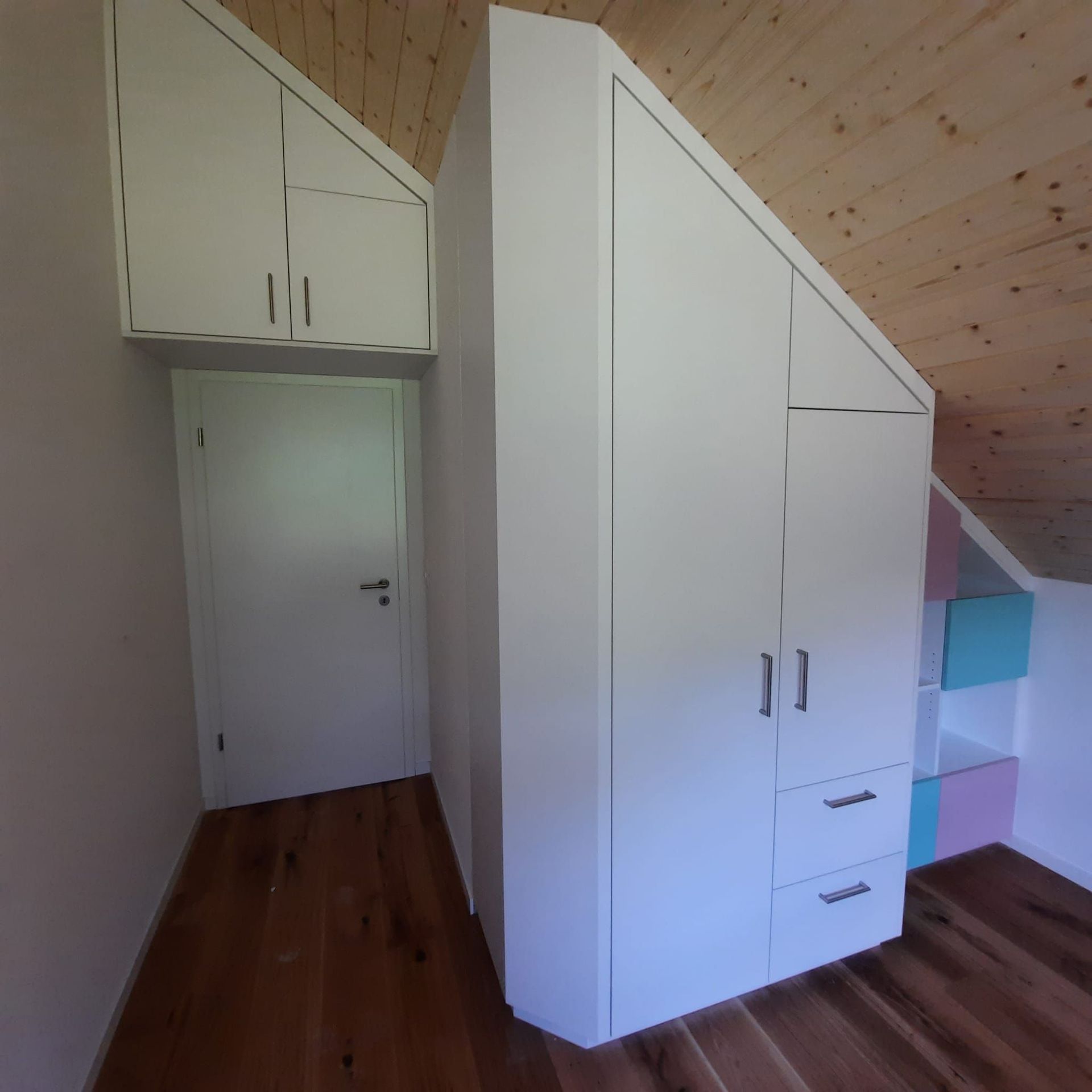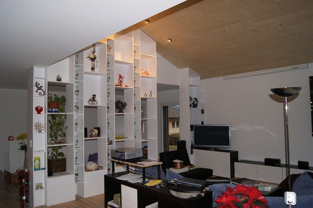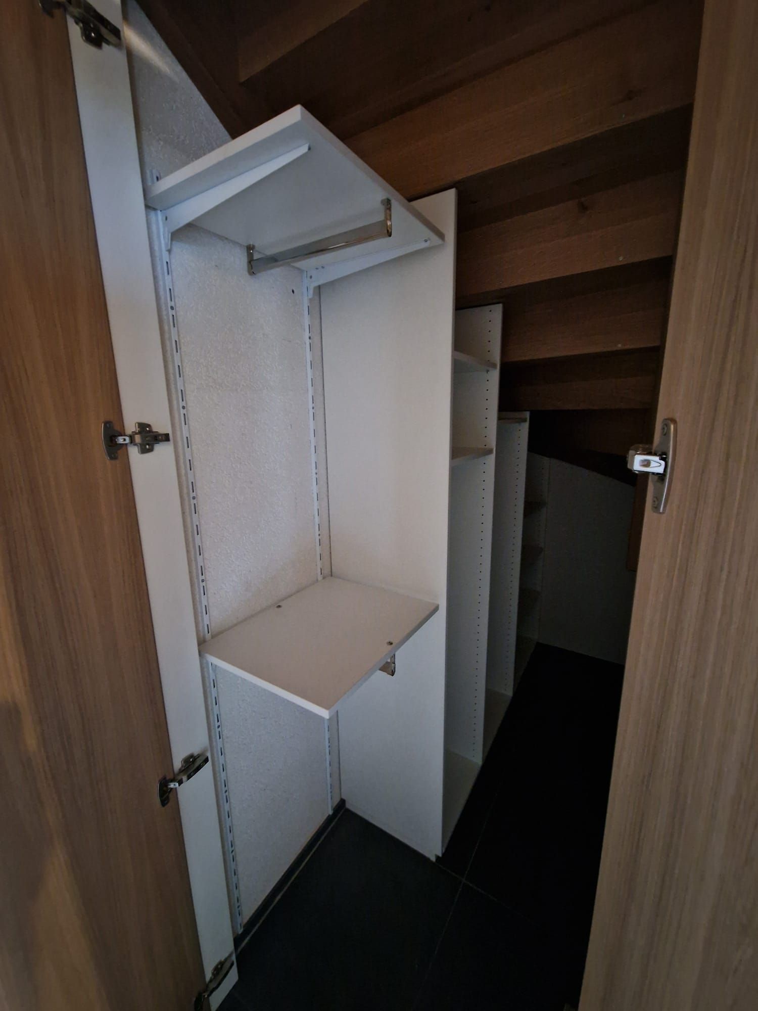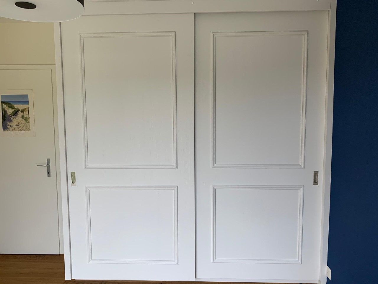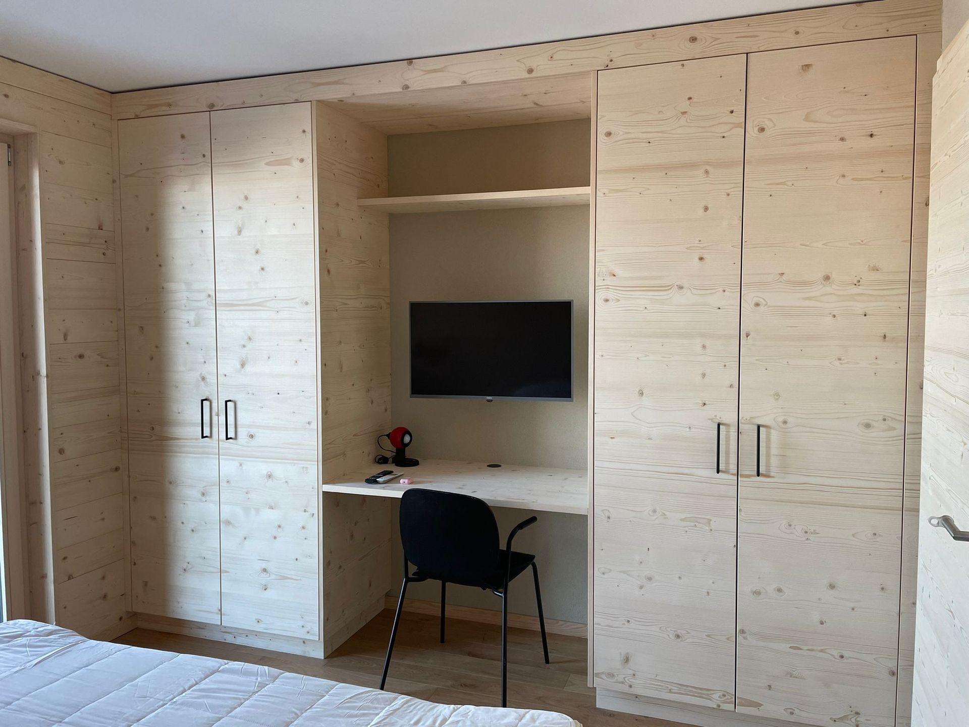 Armoires avec portes coulissantes en mélaminé avec éclairage intérieur, partie supérieure blanche adaptée pour y projeter un écran!