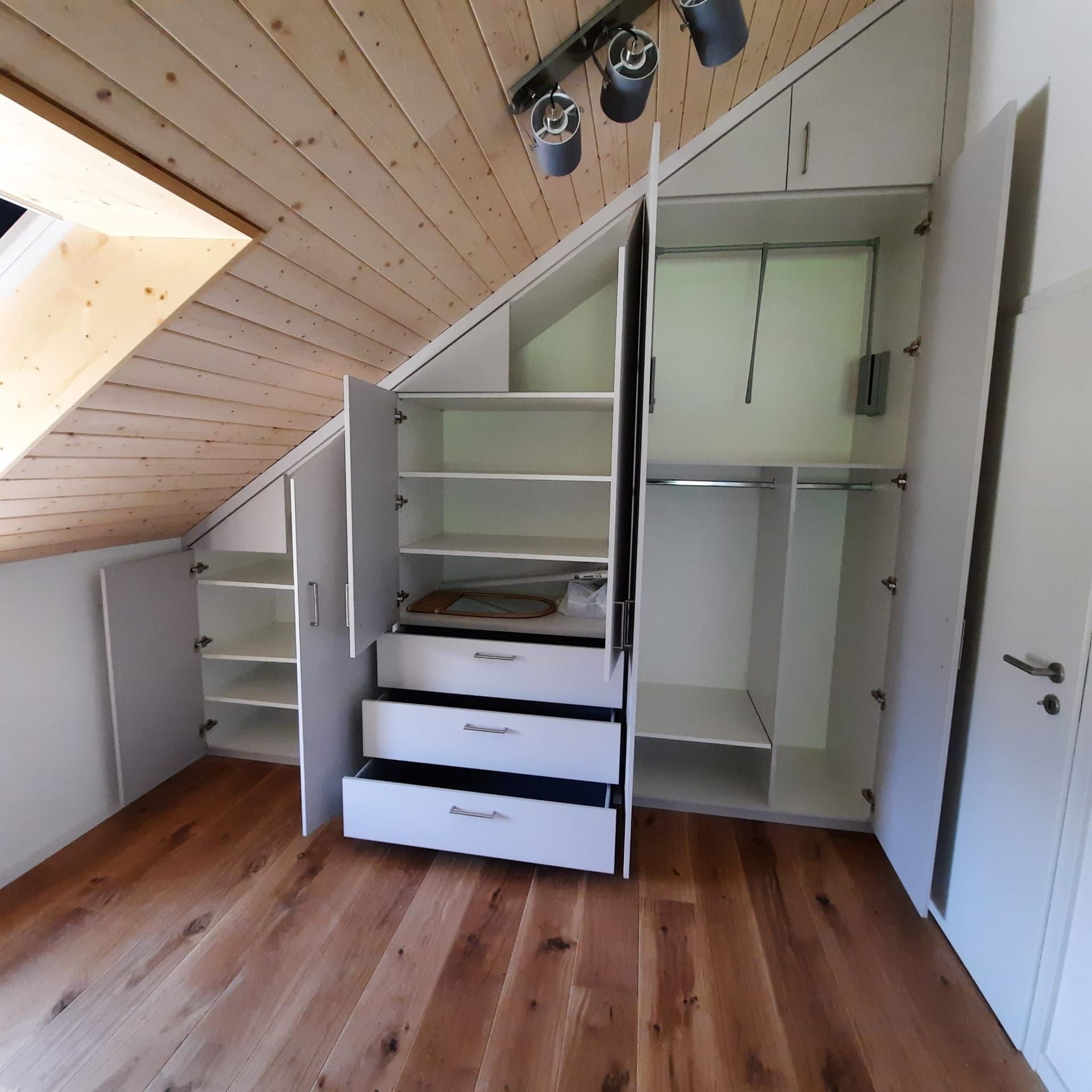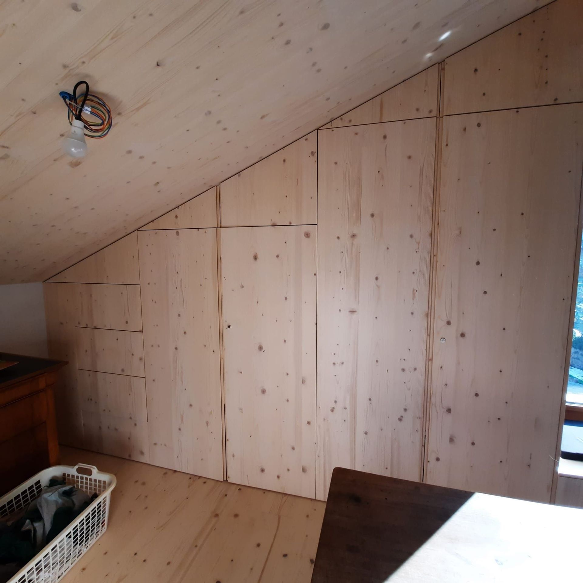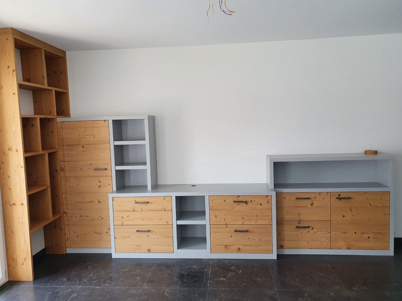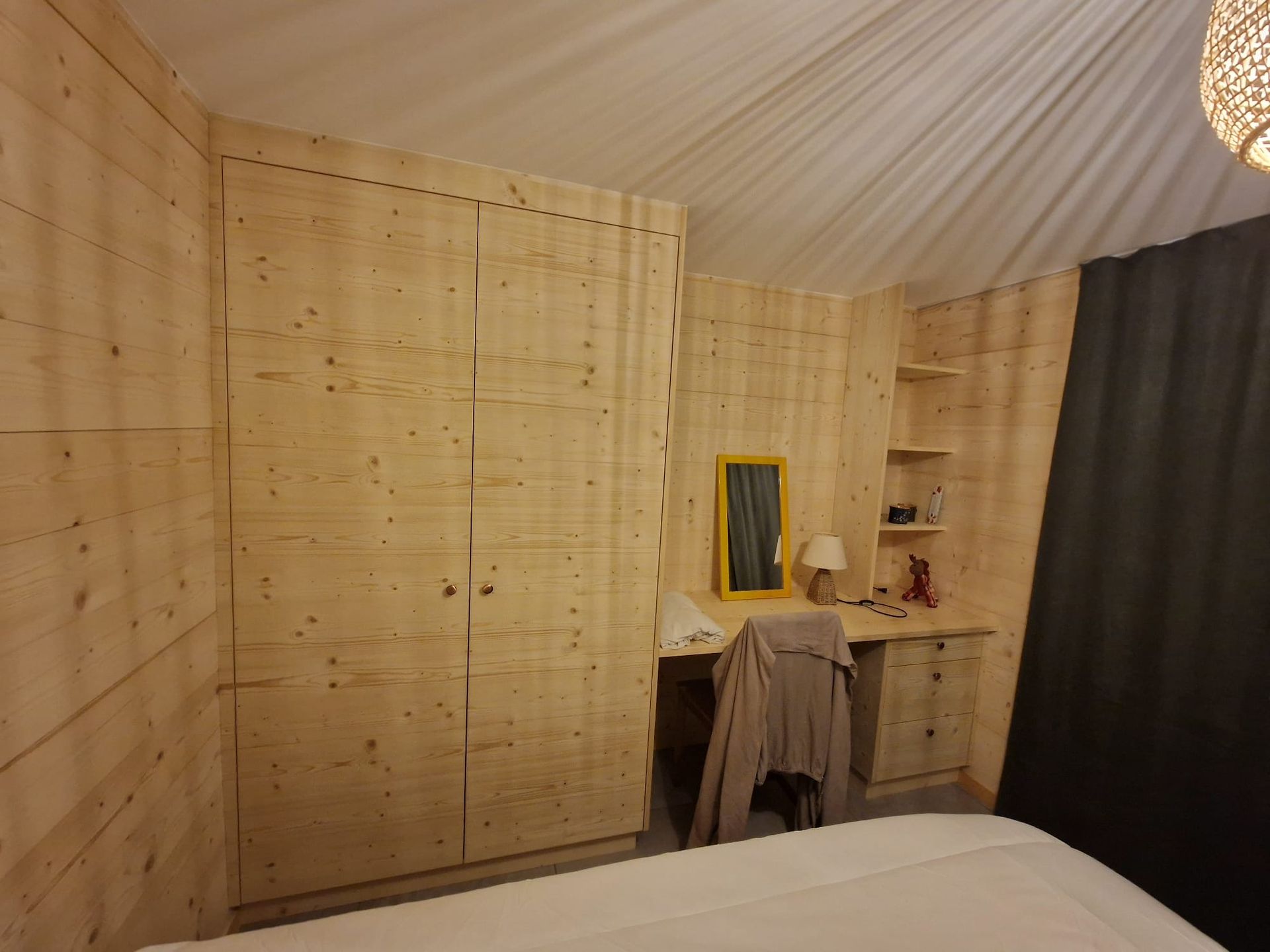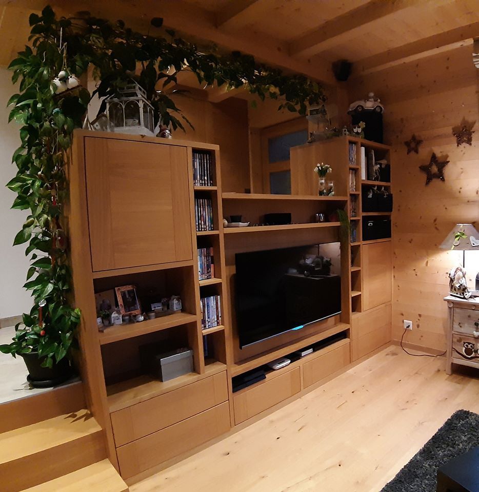 Armoires avec portes coulissantes en mélaminé avec éclairage intérieur, partie supérieure blanche adaptée pour y projeter un écran!