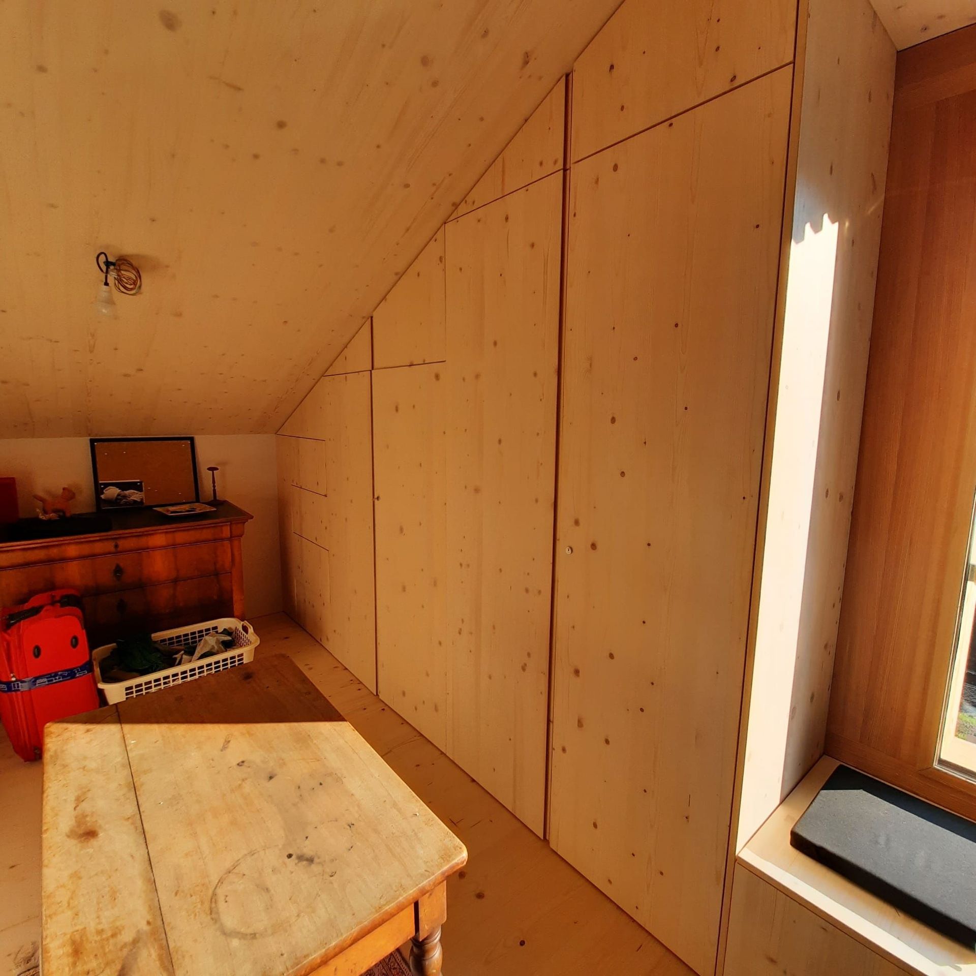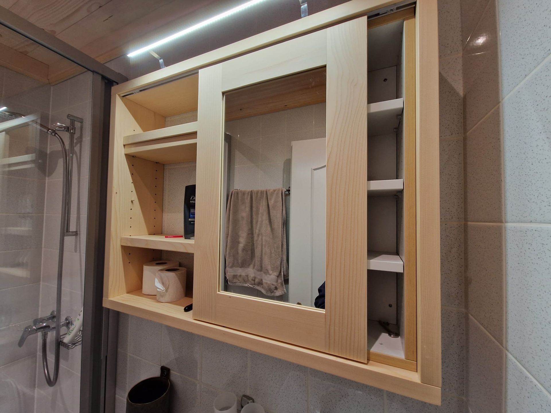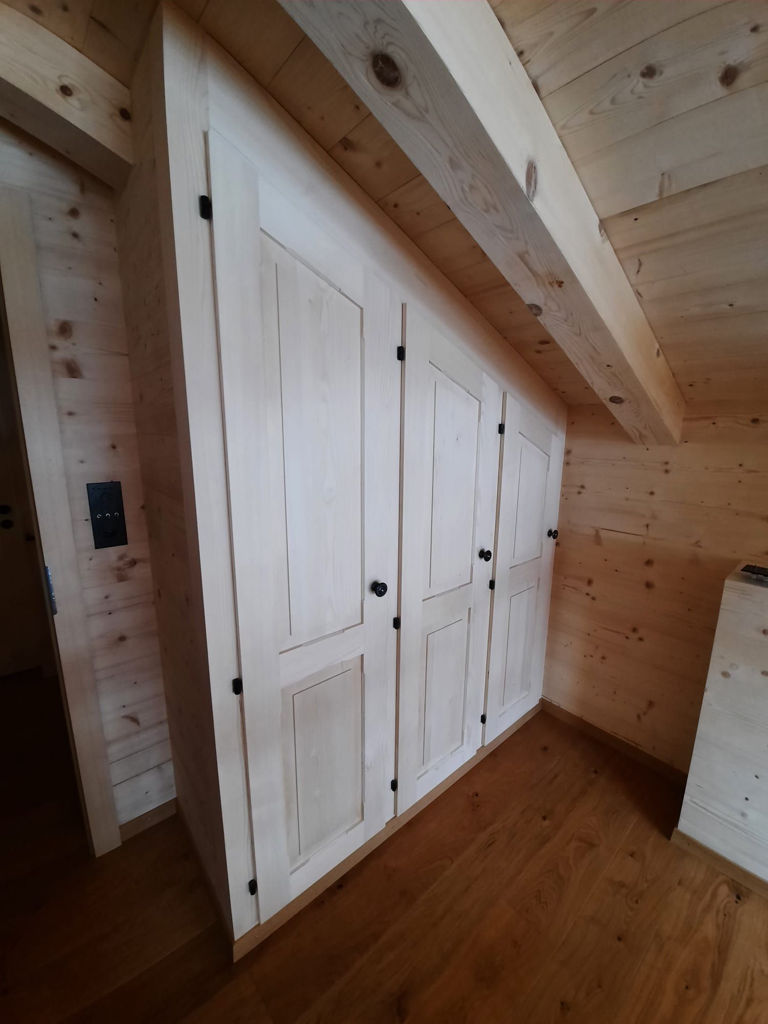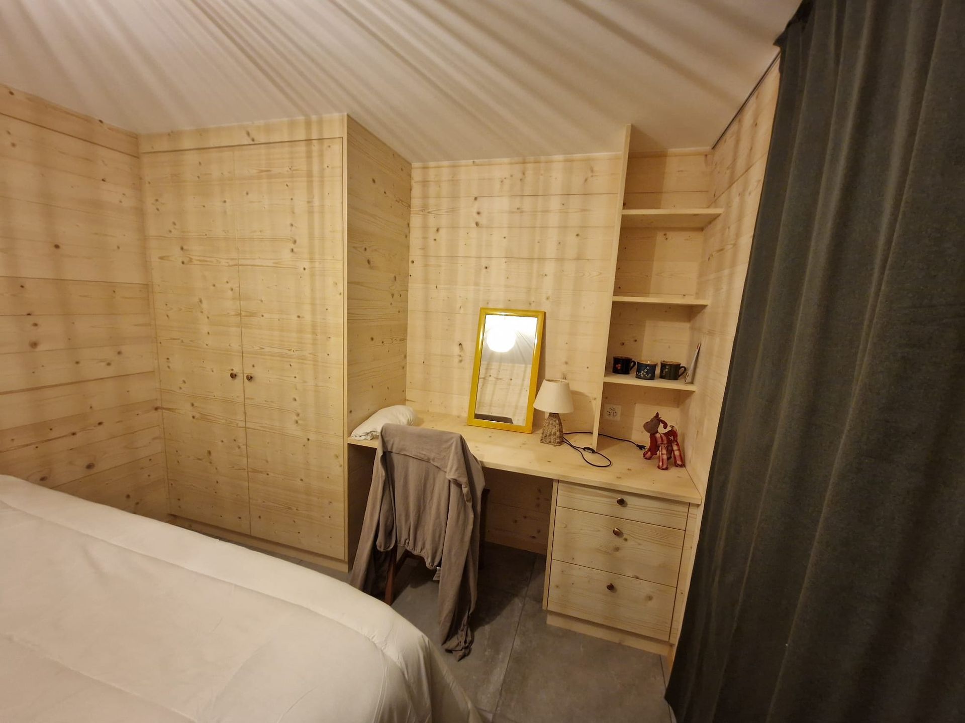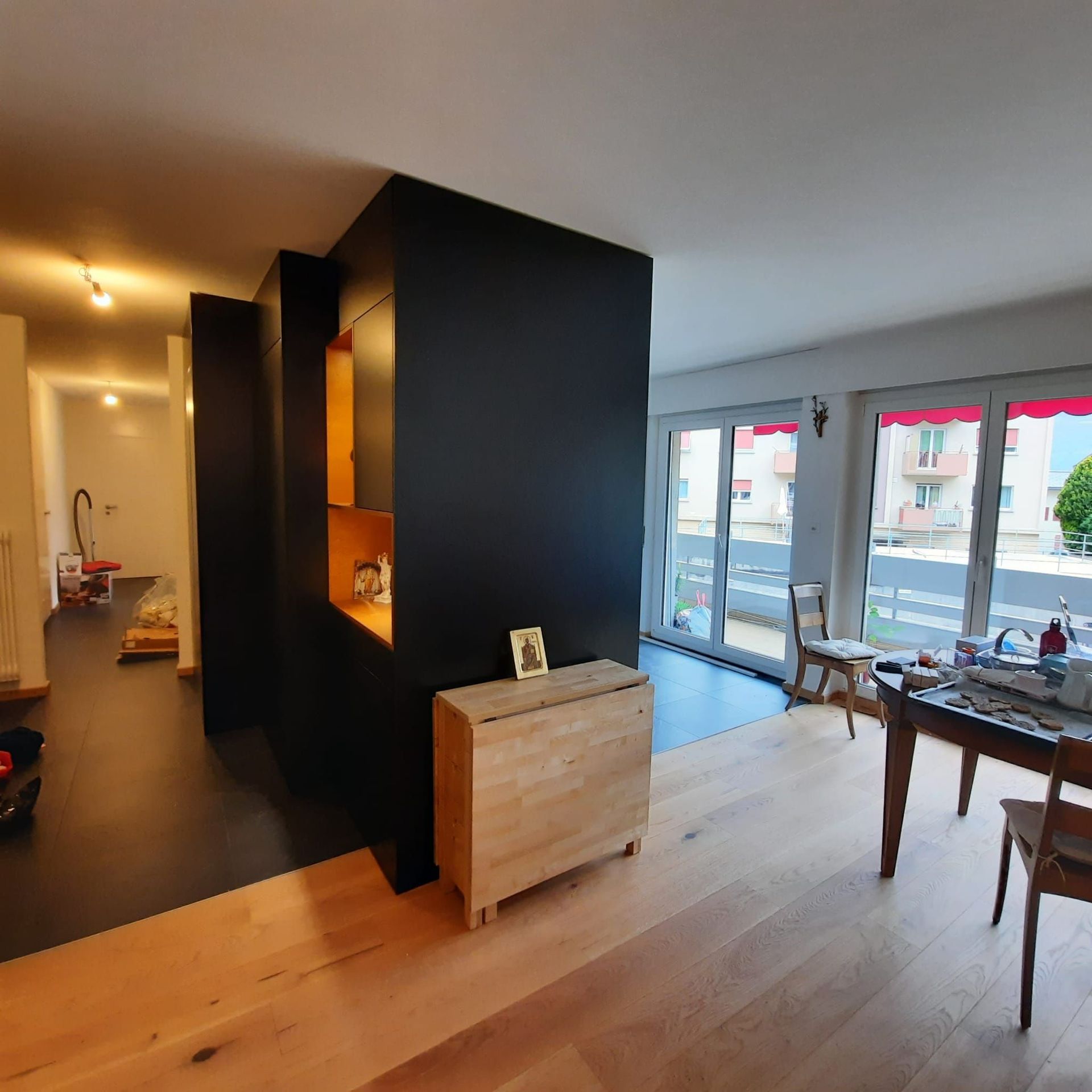 Armoires avec portes coulissantes en mélaminé avec éclairage intérieur, partie supérieure blanche adaptée pour y projeter un écran!