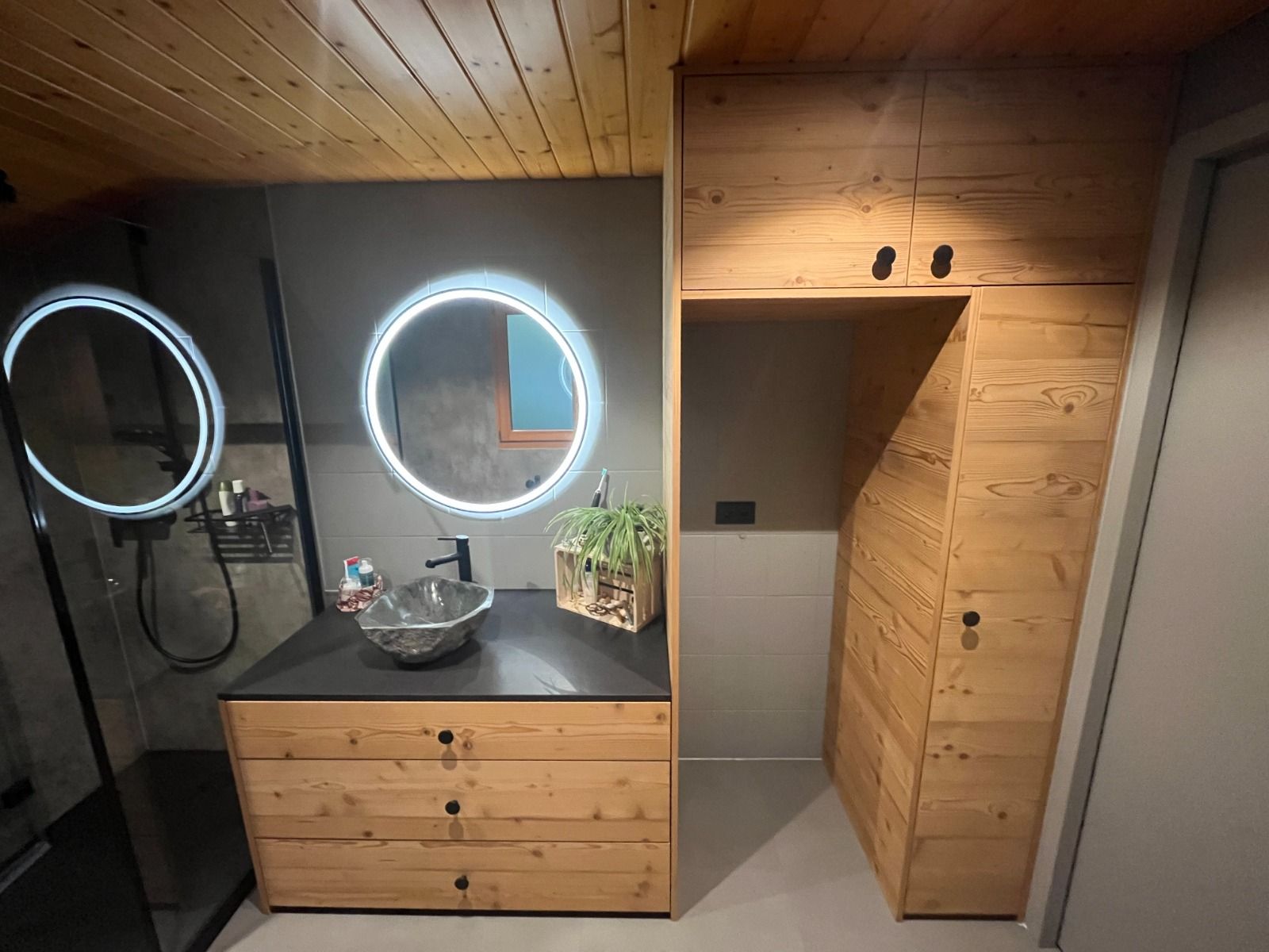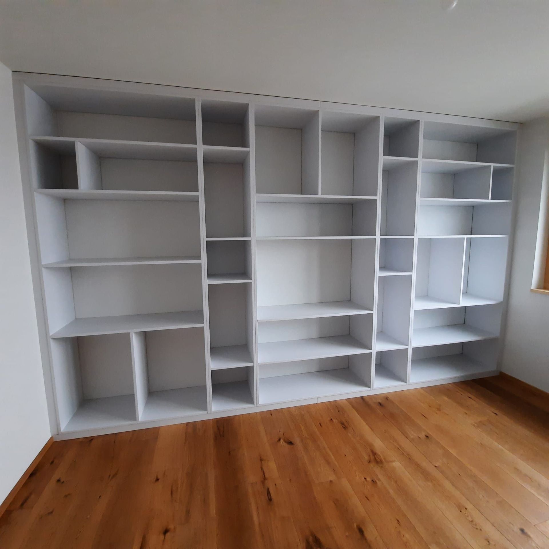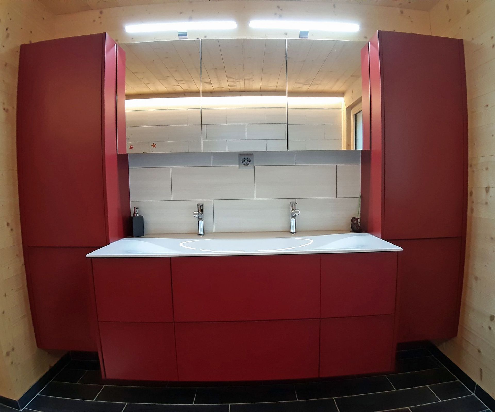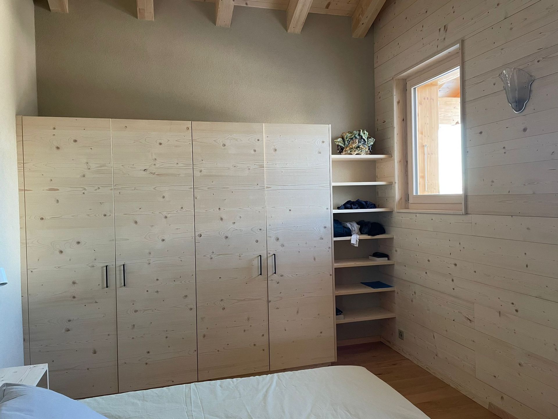 Armoires avec portes coulissantes en mélaminé avec éclairage intérieur, partie supérieure blanche adaptée pour y projeter un écran!