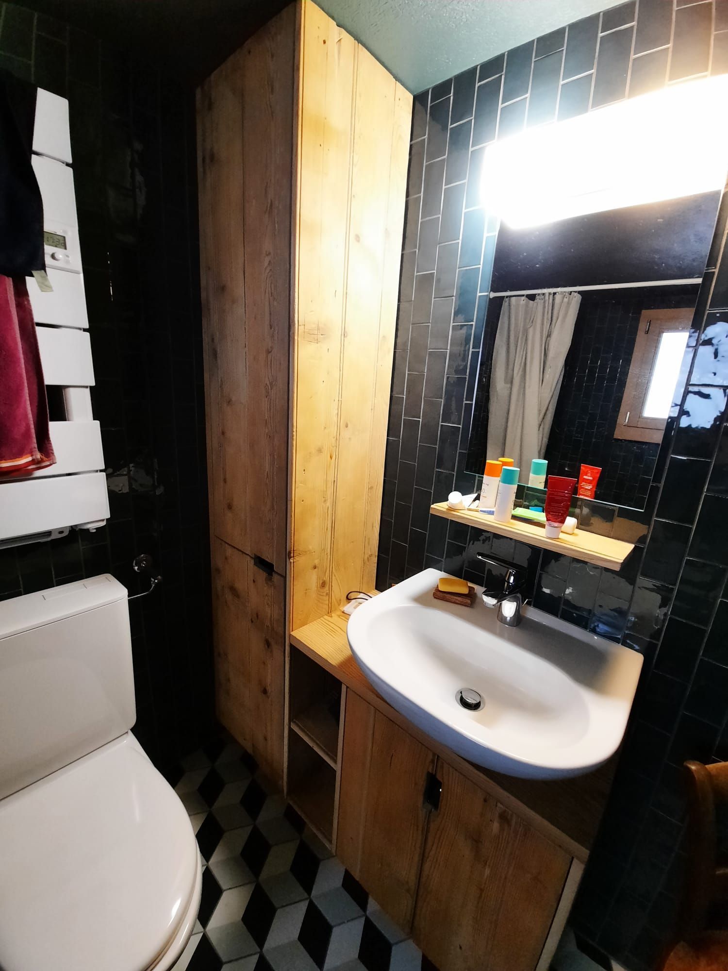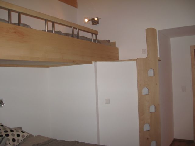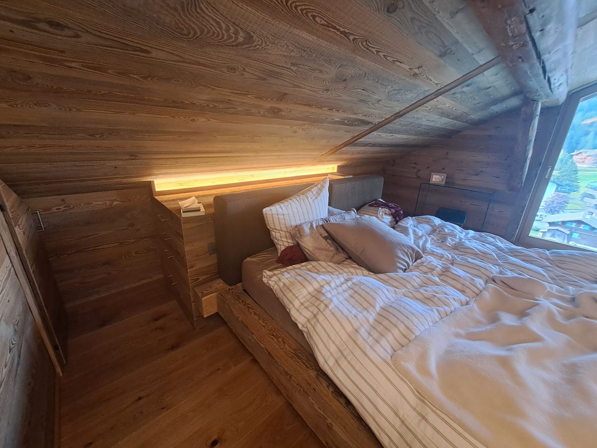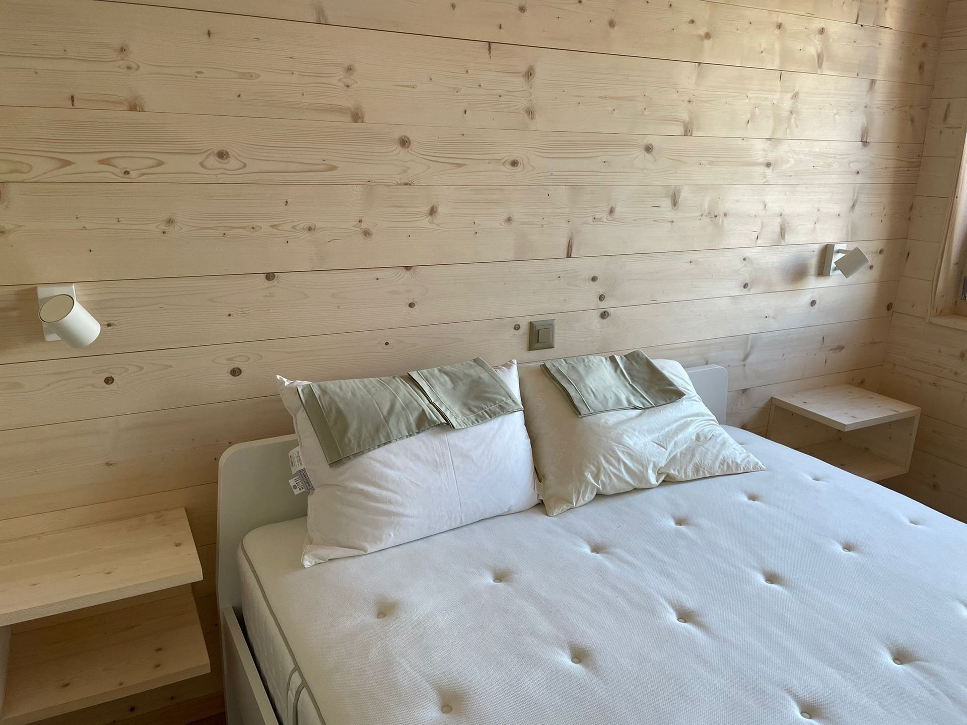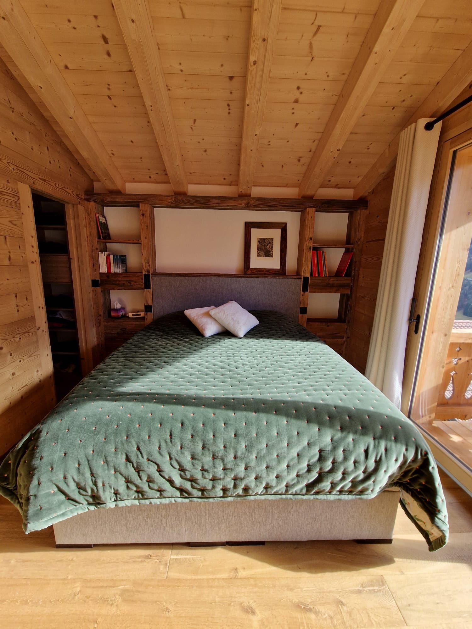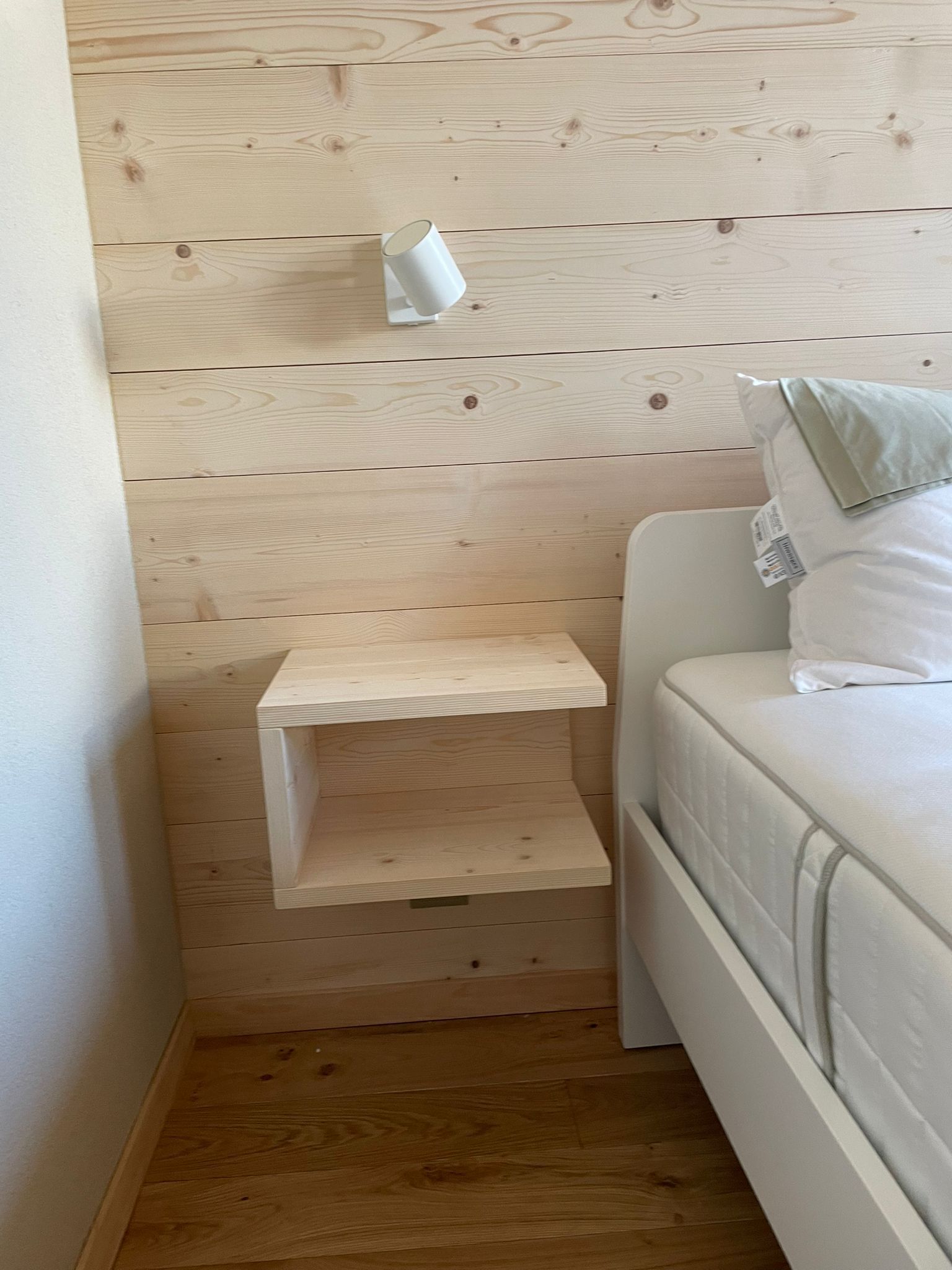 Tête de lit peinte avec liteaux collés en applique.