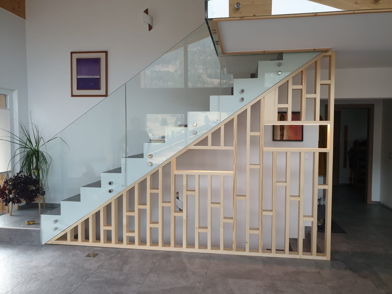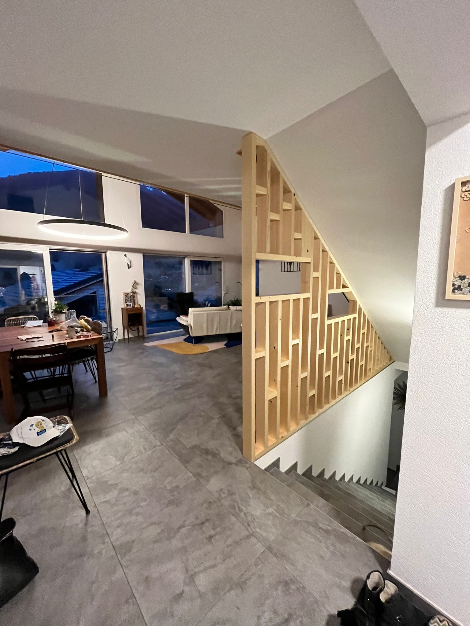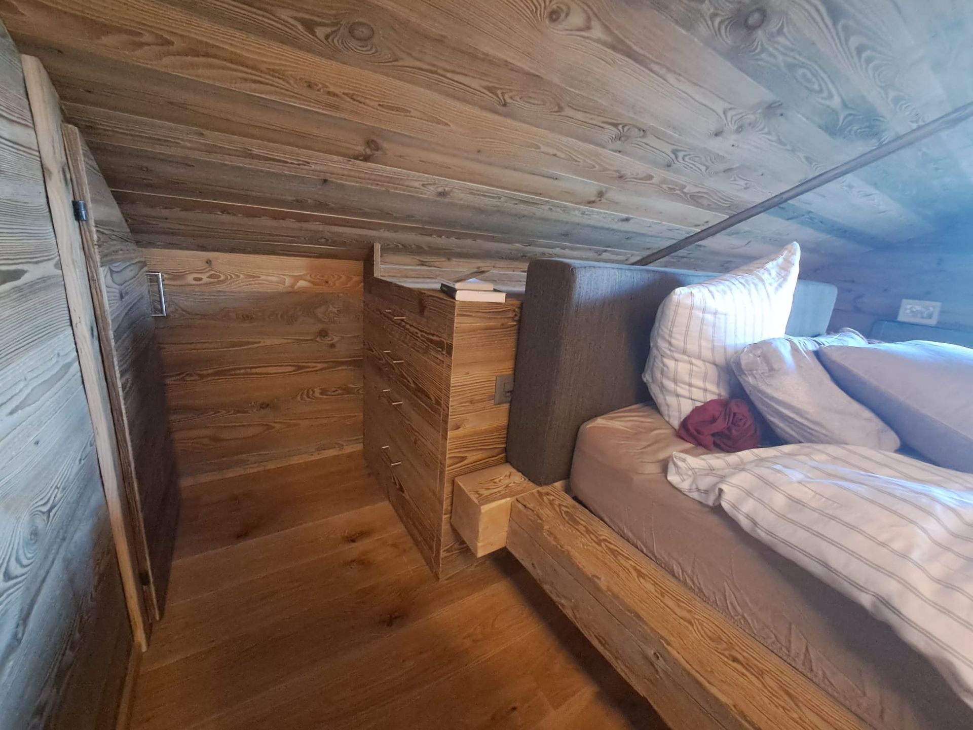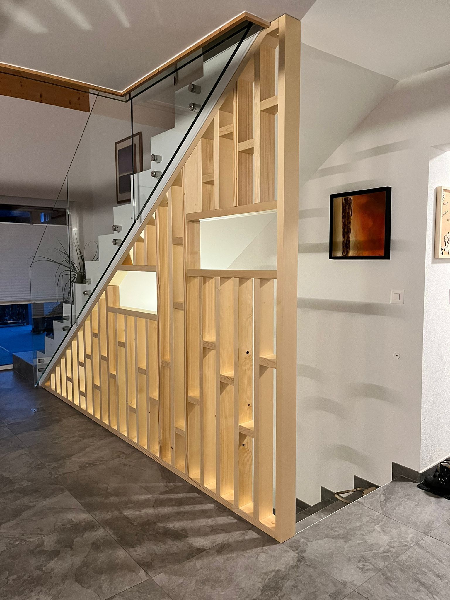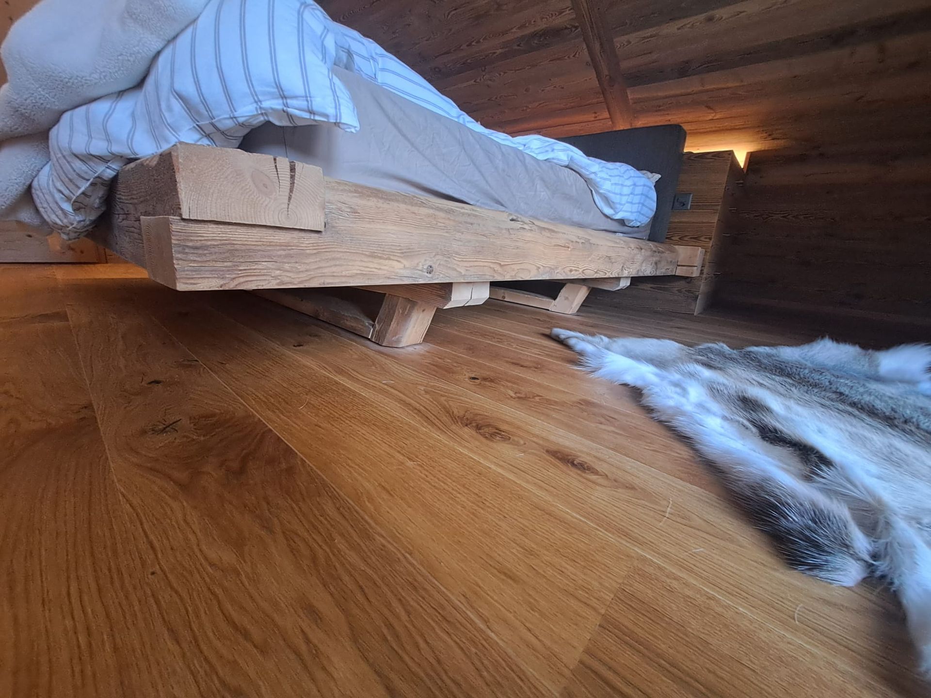 Tête de lit peinte avec liteaux collés en applique.