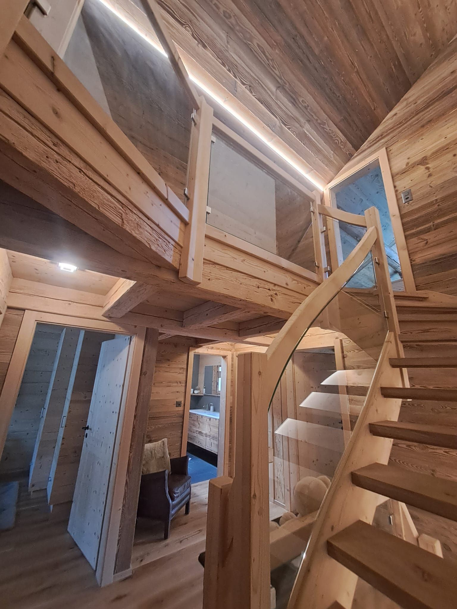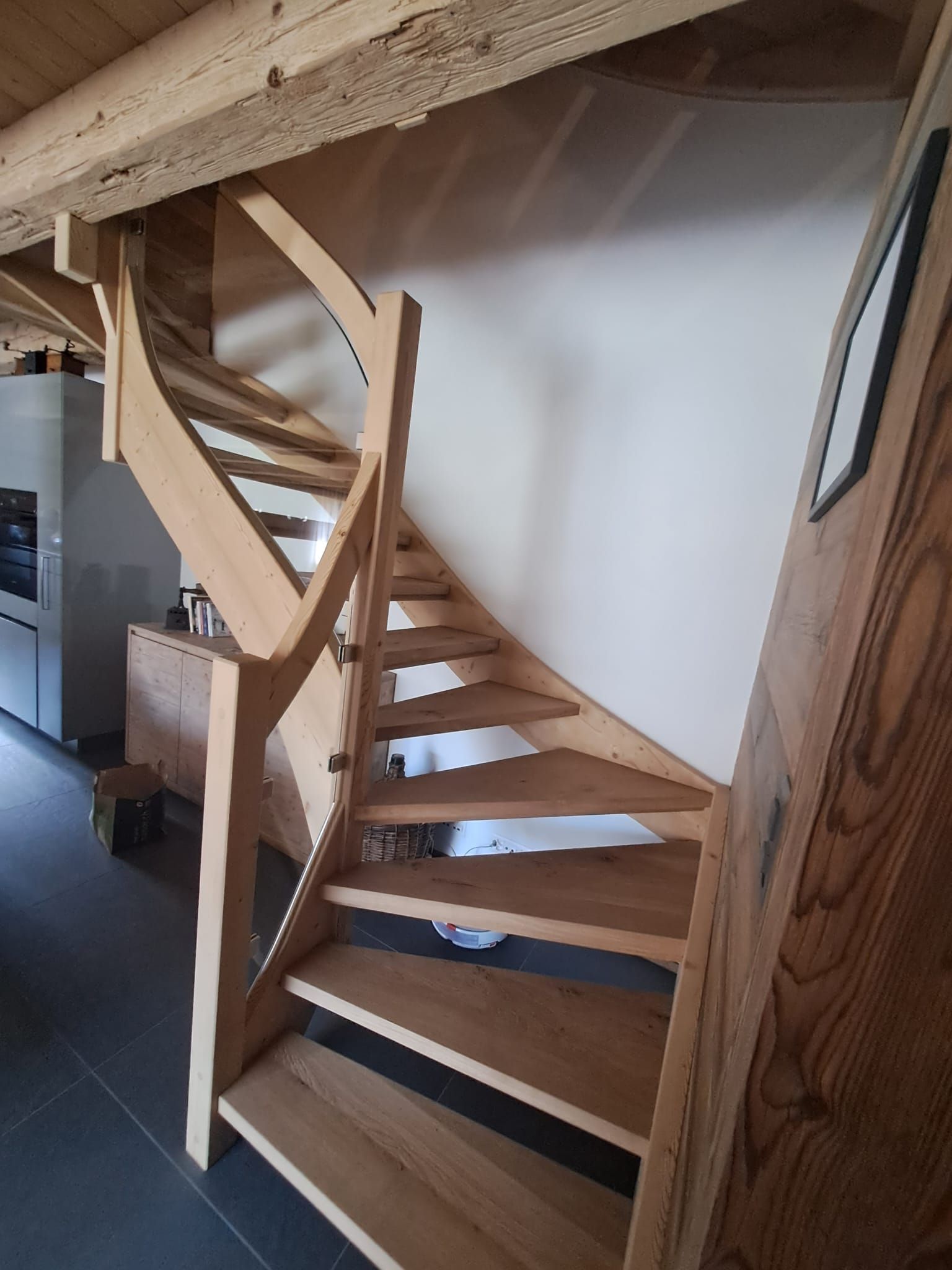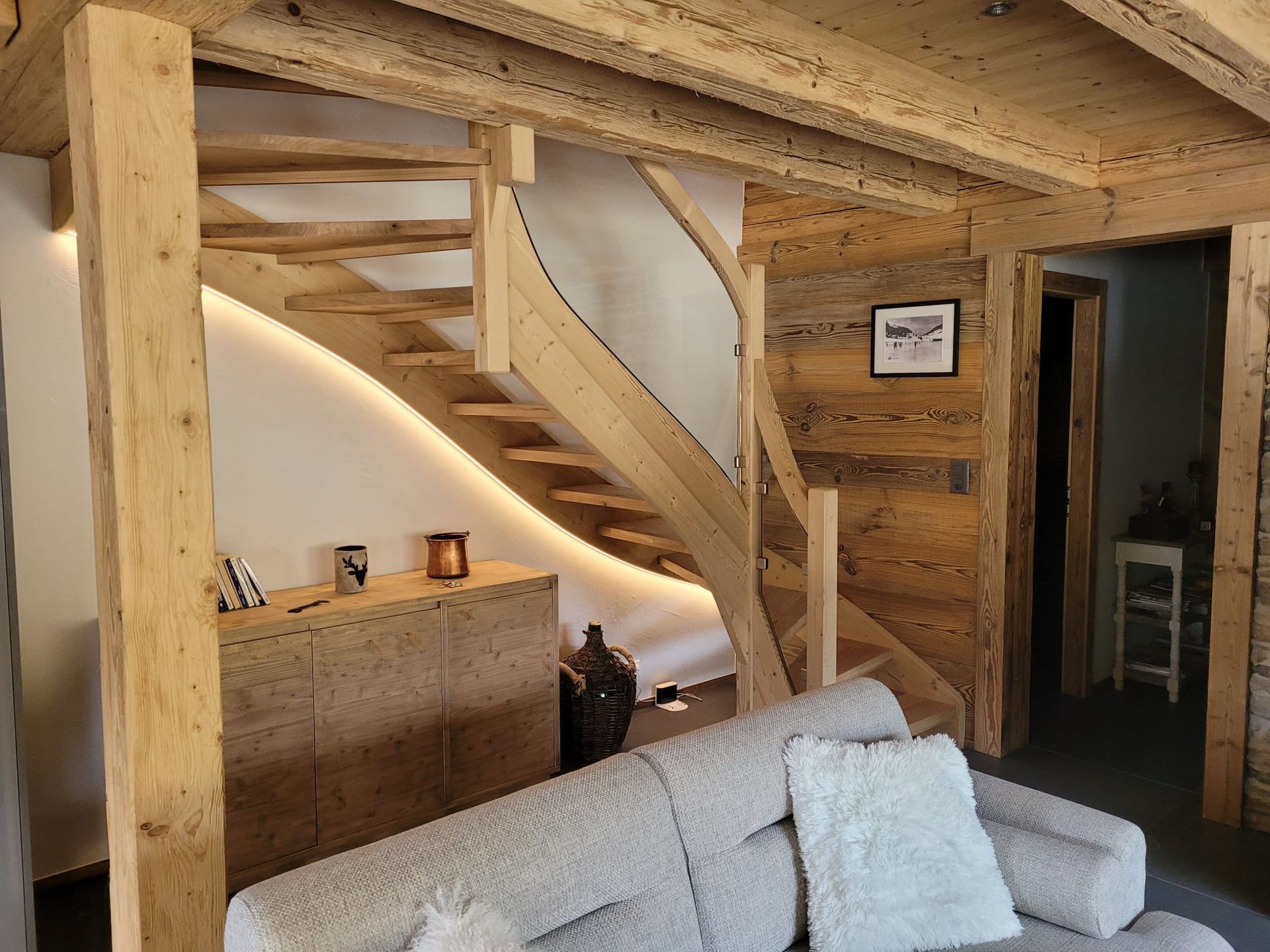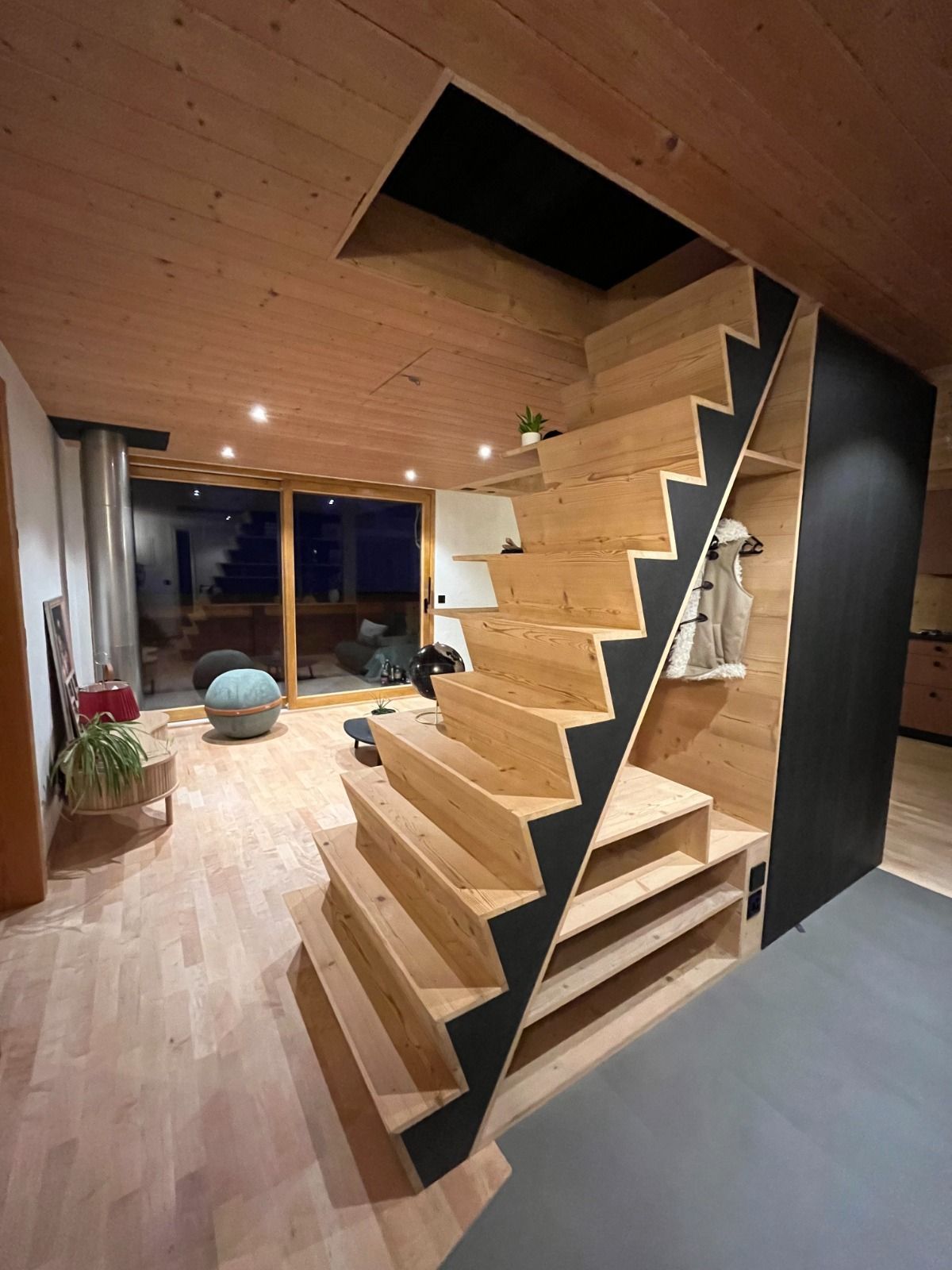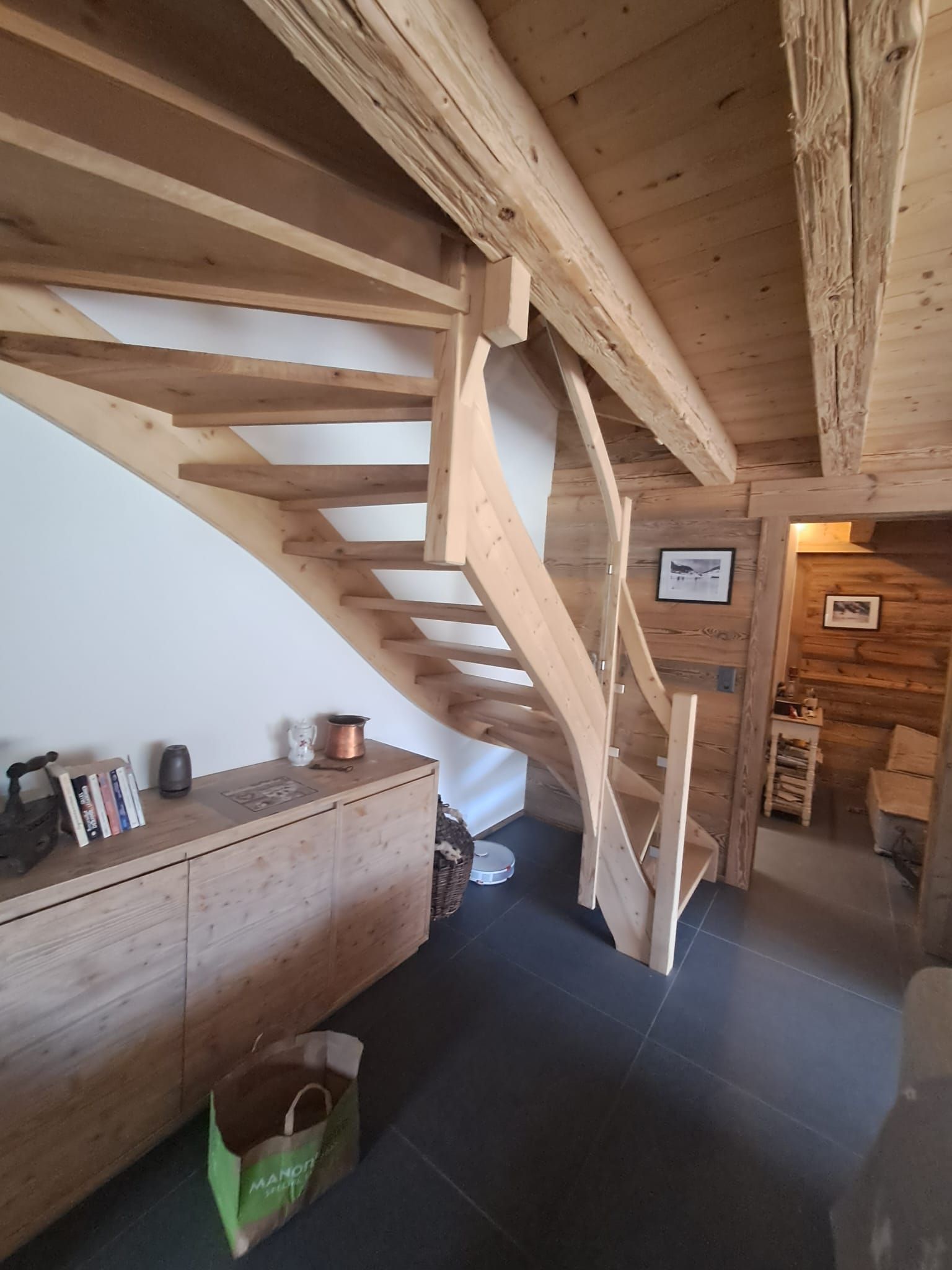 Escalier en vieux bois construit avec le madrier démonté sur place lors de la rénovation