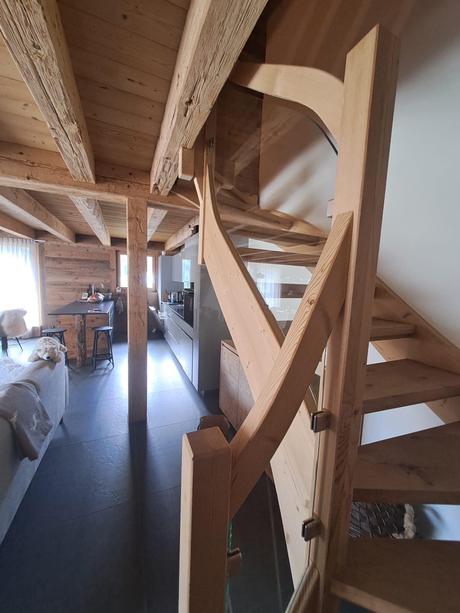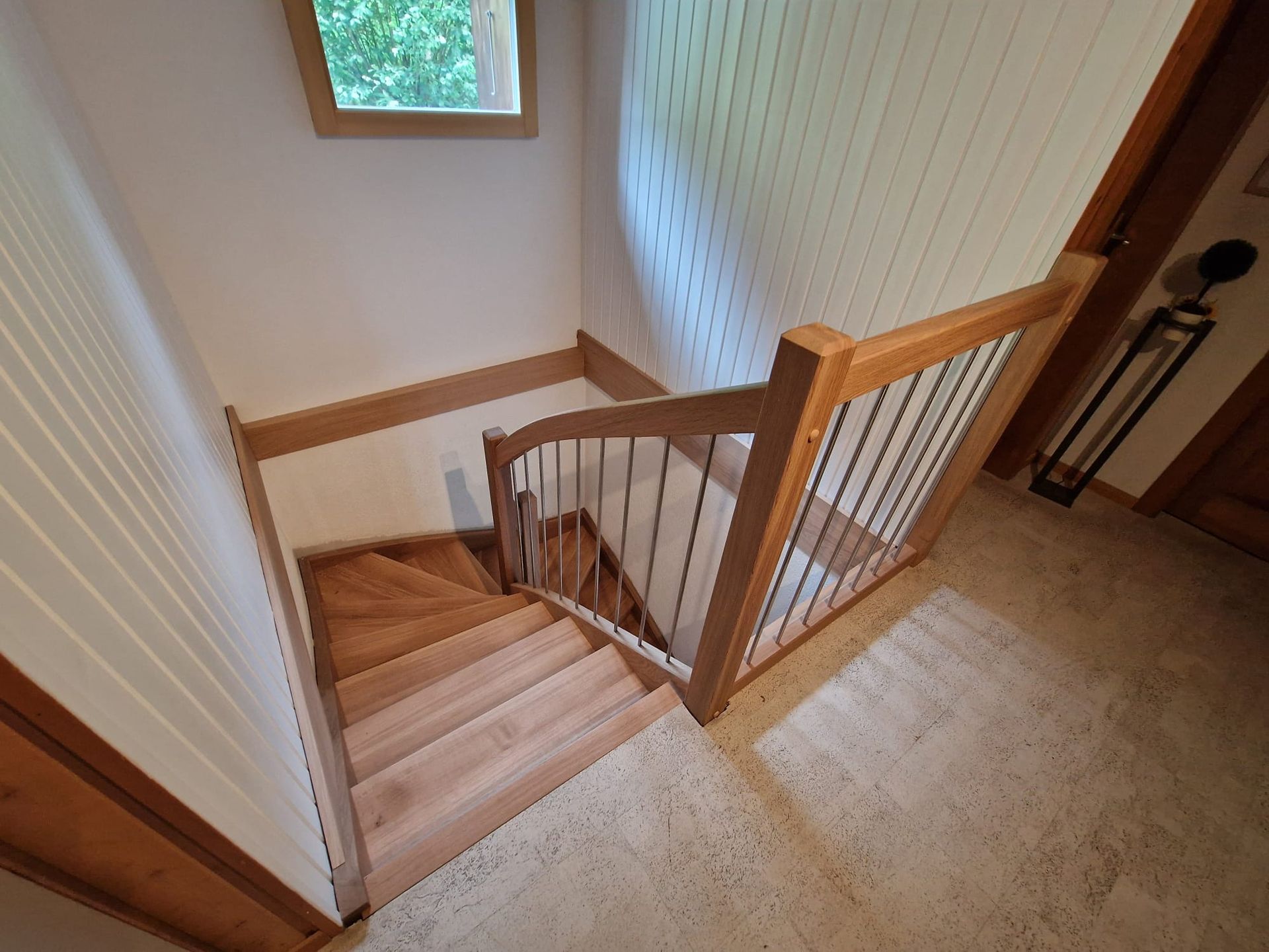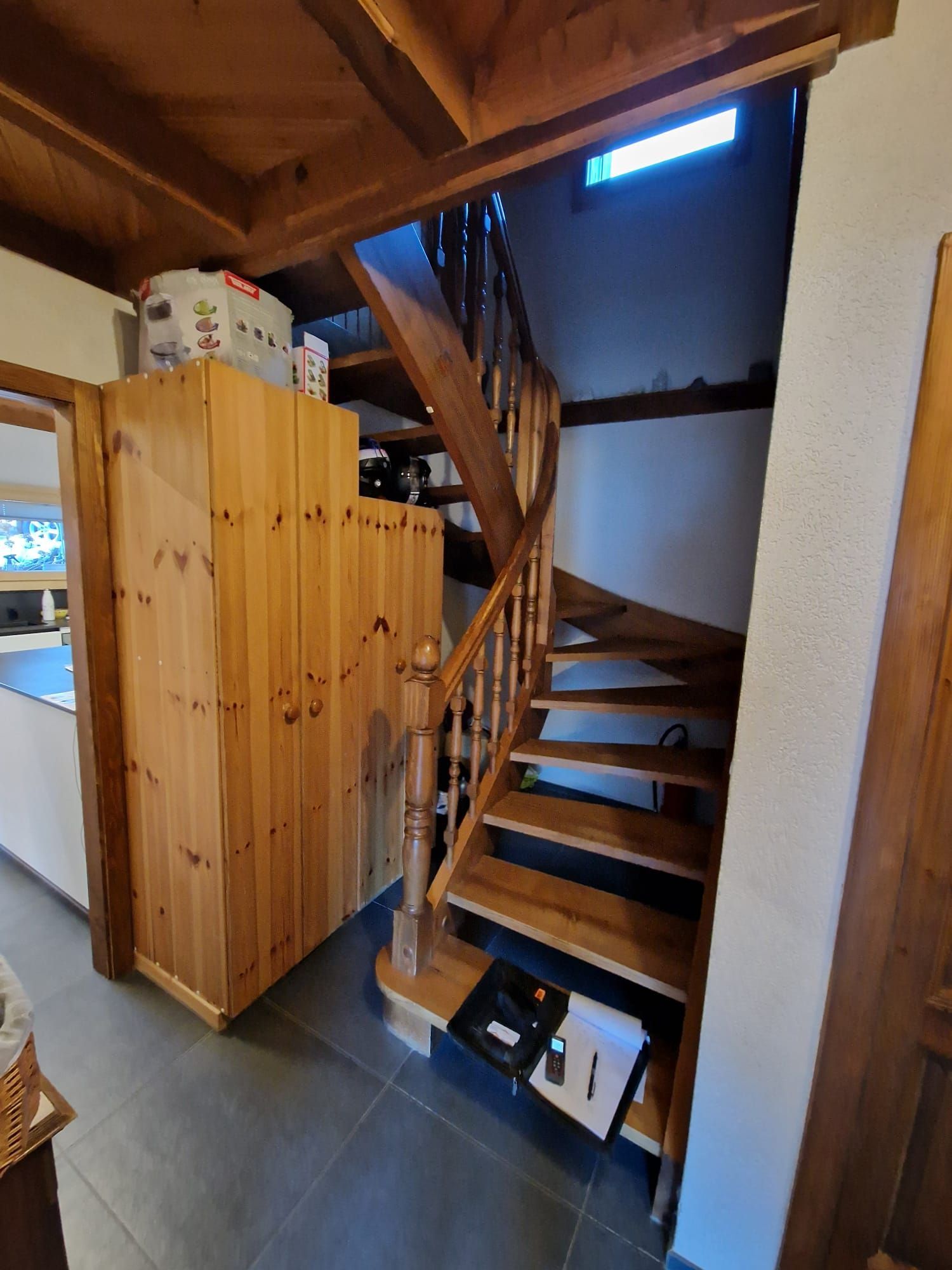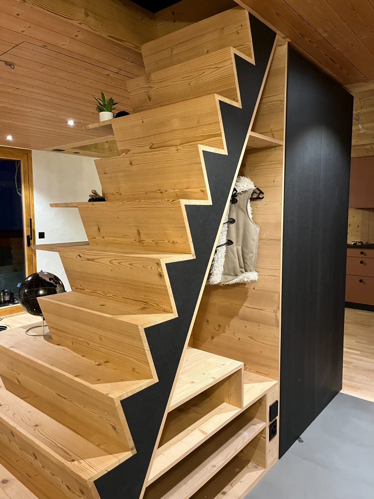 Escalier en vieux bois construit avec le madrier démonté sur place lors de la rénovation