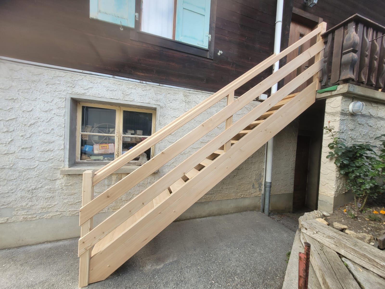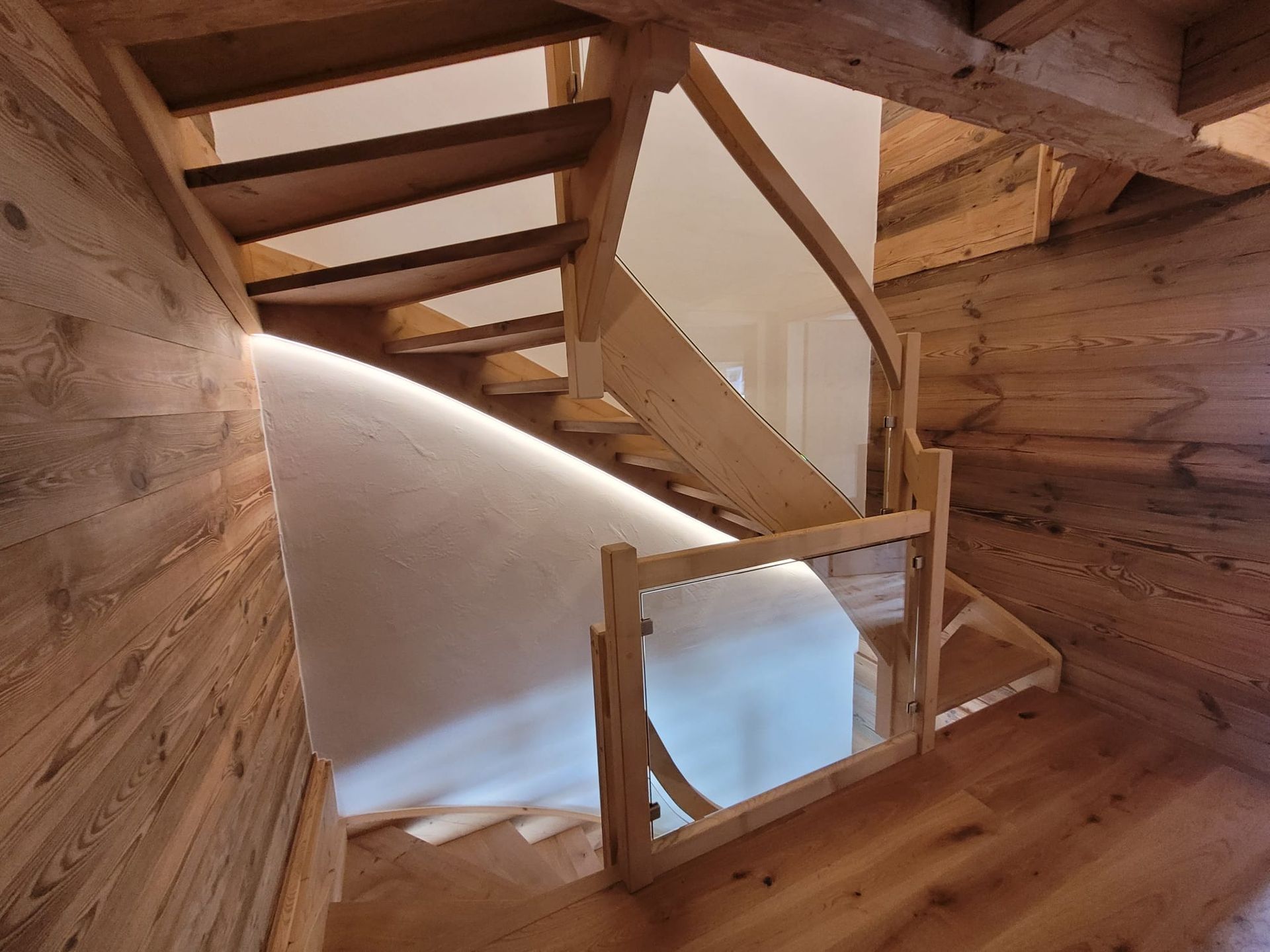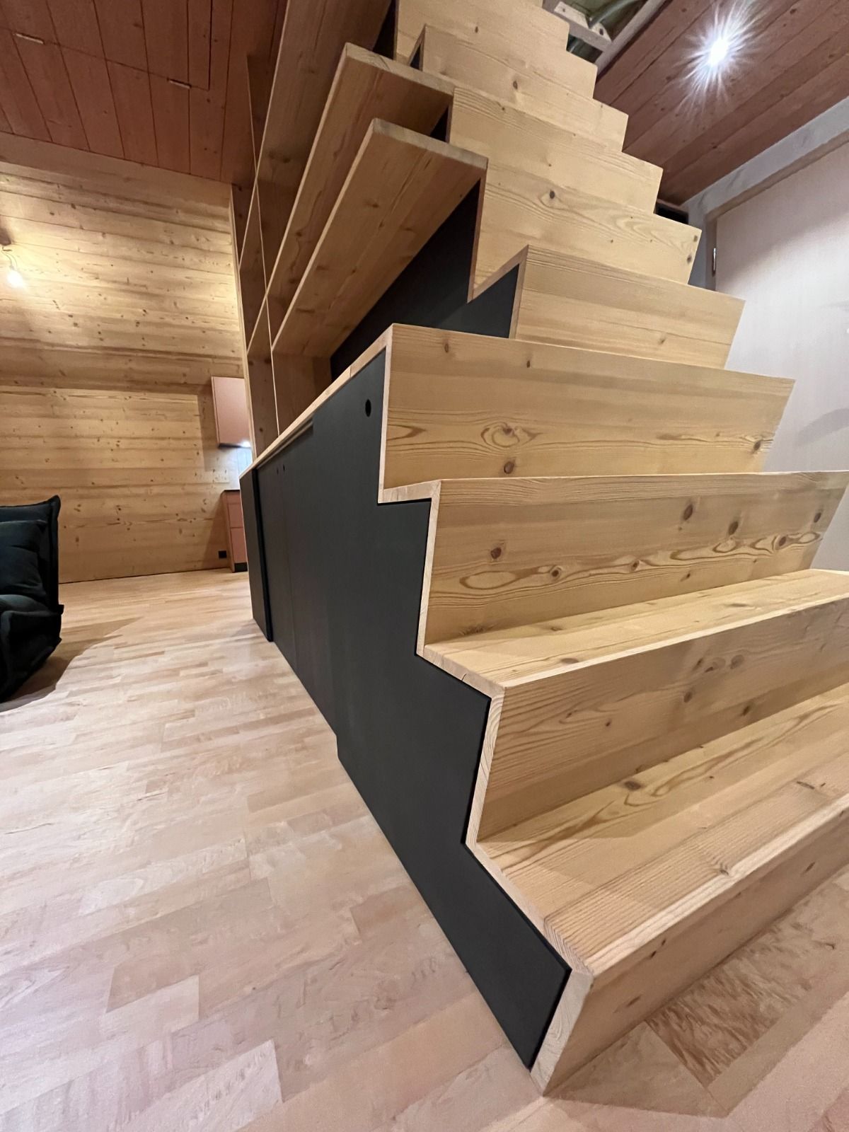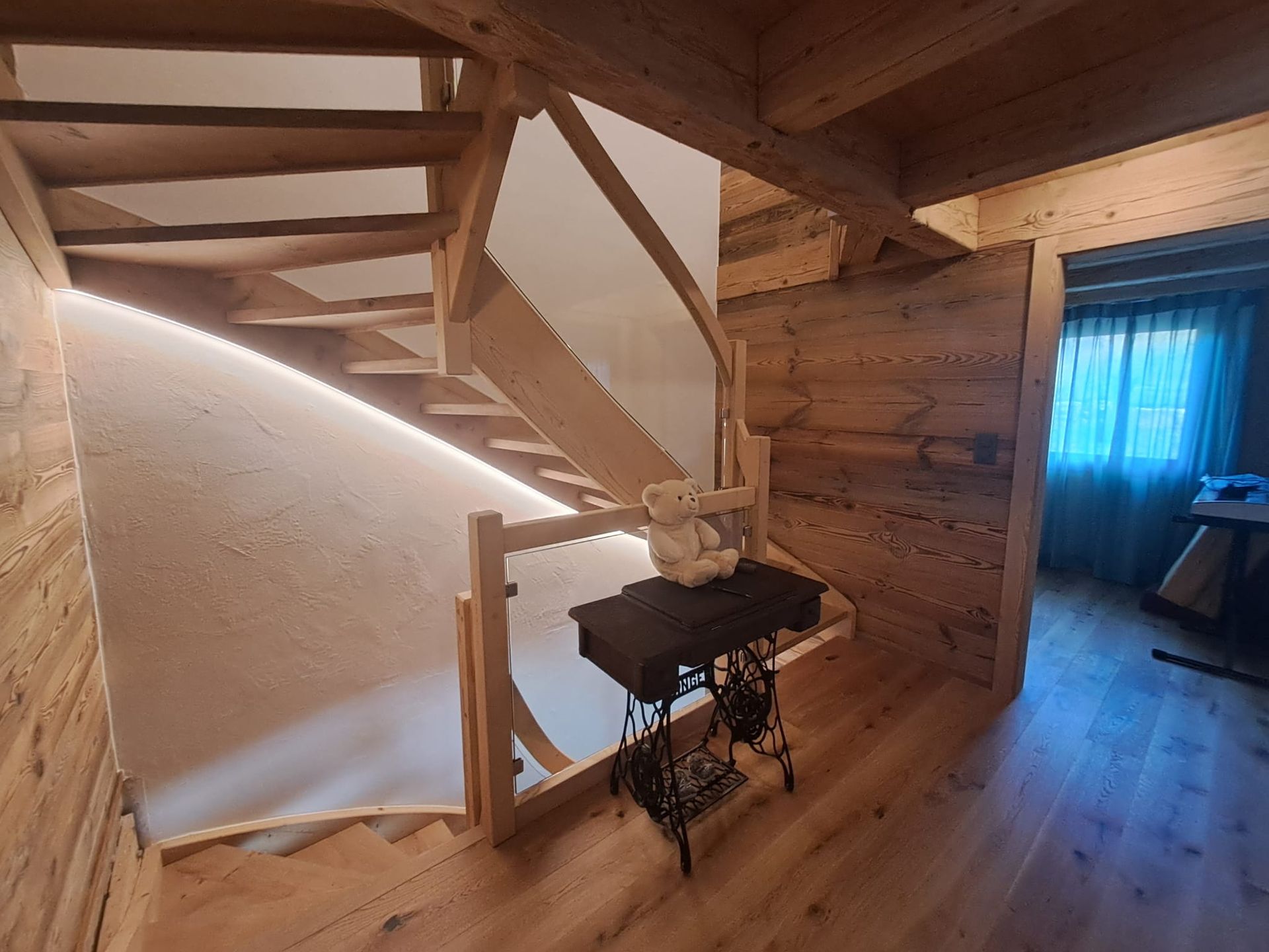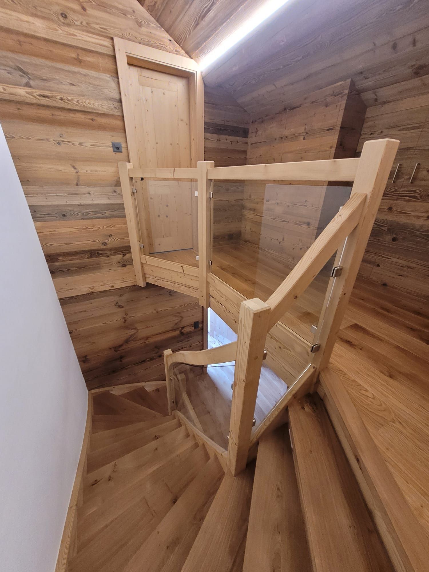 Escalier en vieux bois construit avec le madrier démonté sur place lors de la rénovation