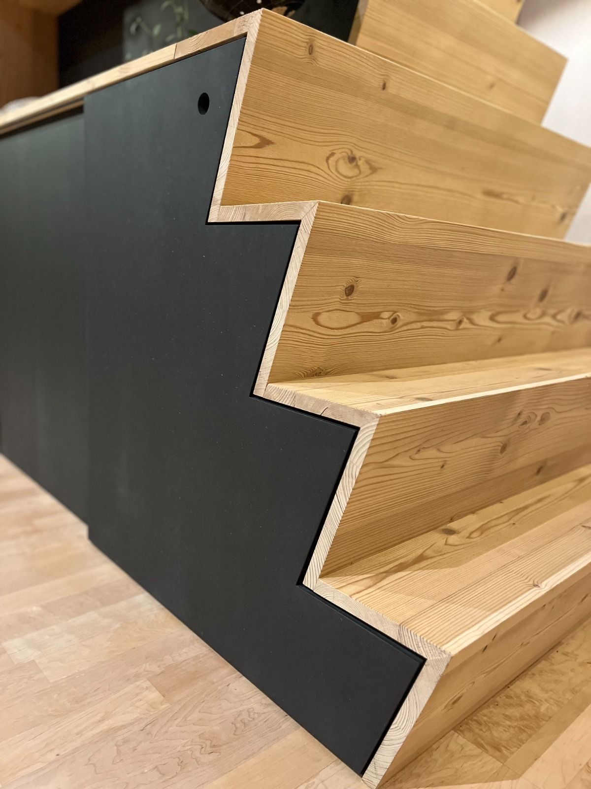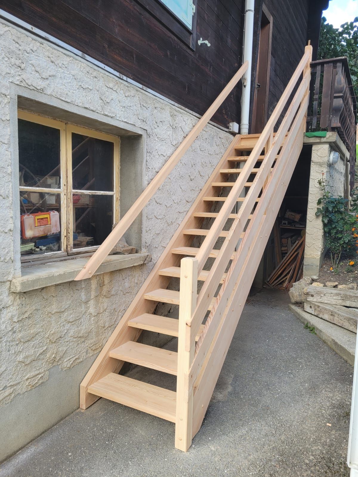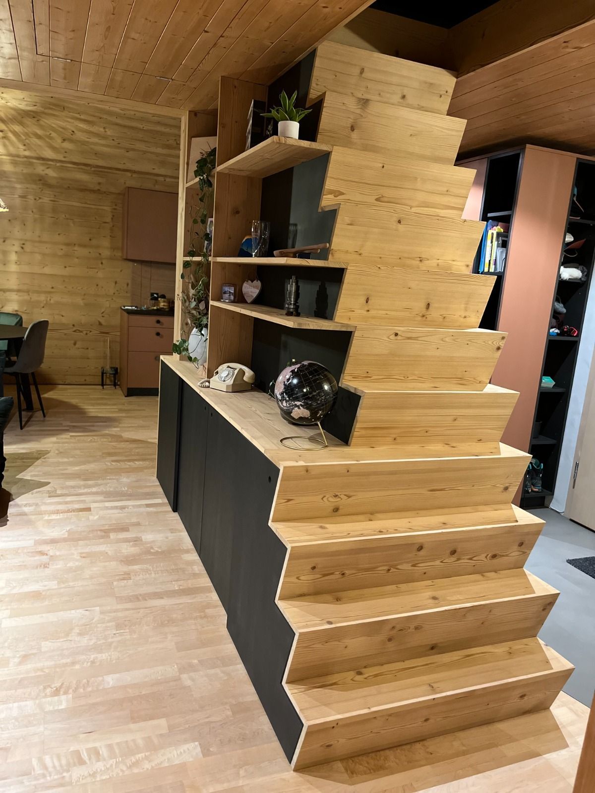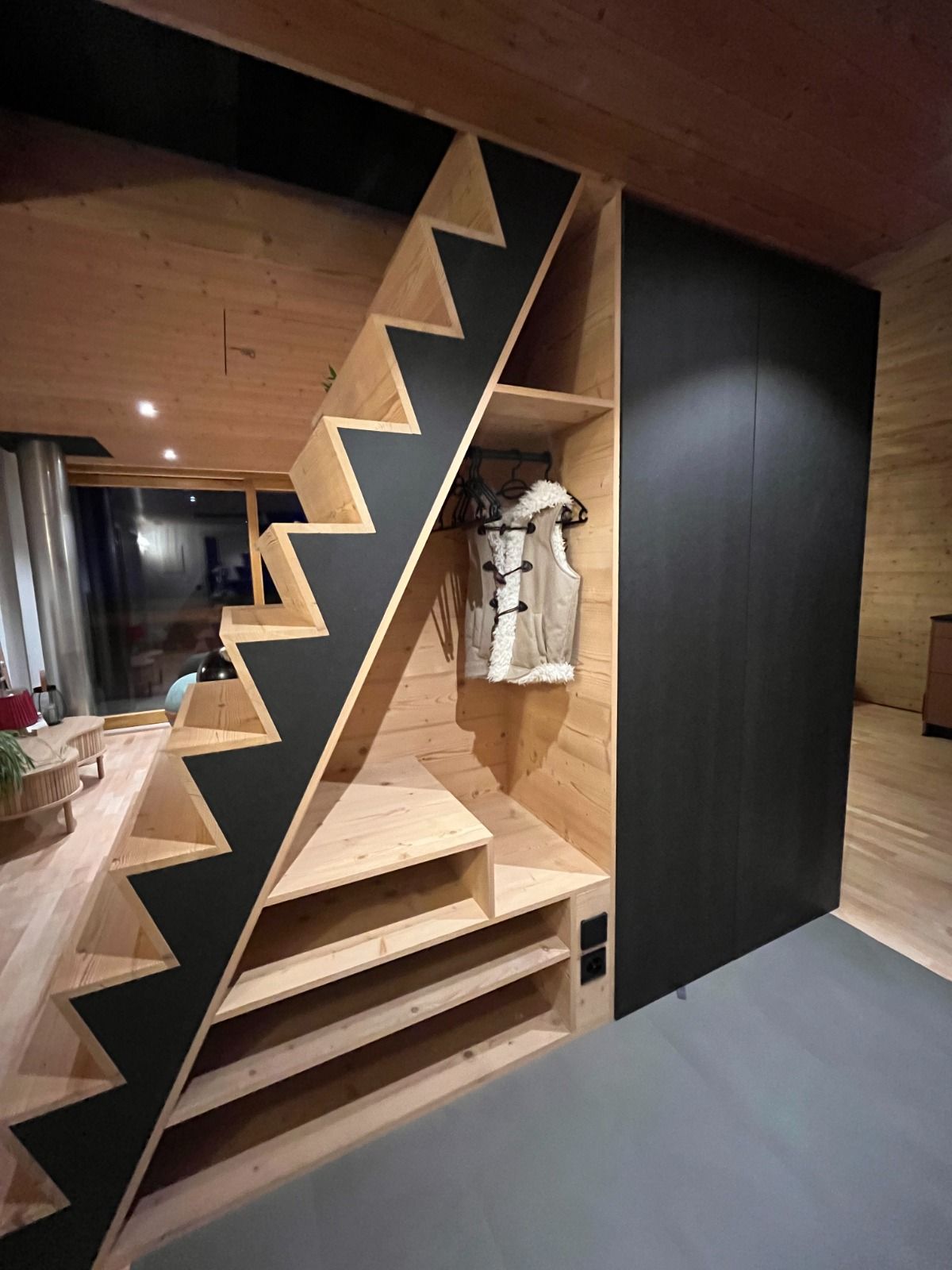 Escalier en vieux bois construit avec le madrier démonté sur place lors de la rénovation