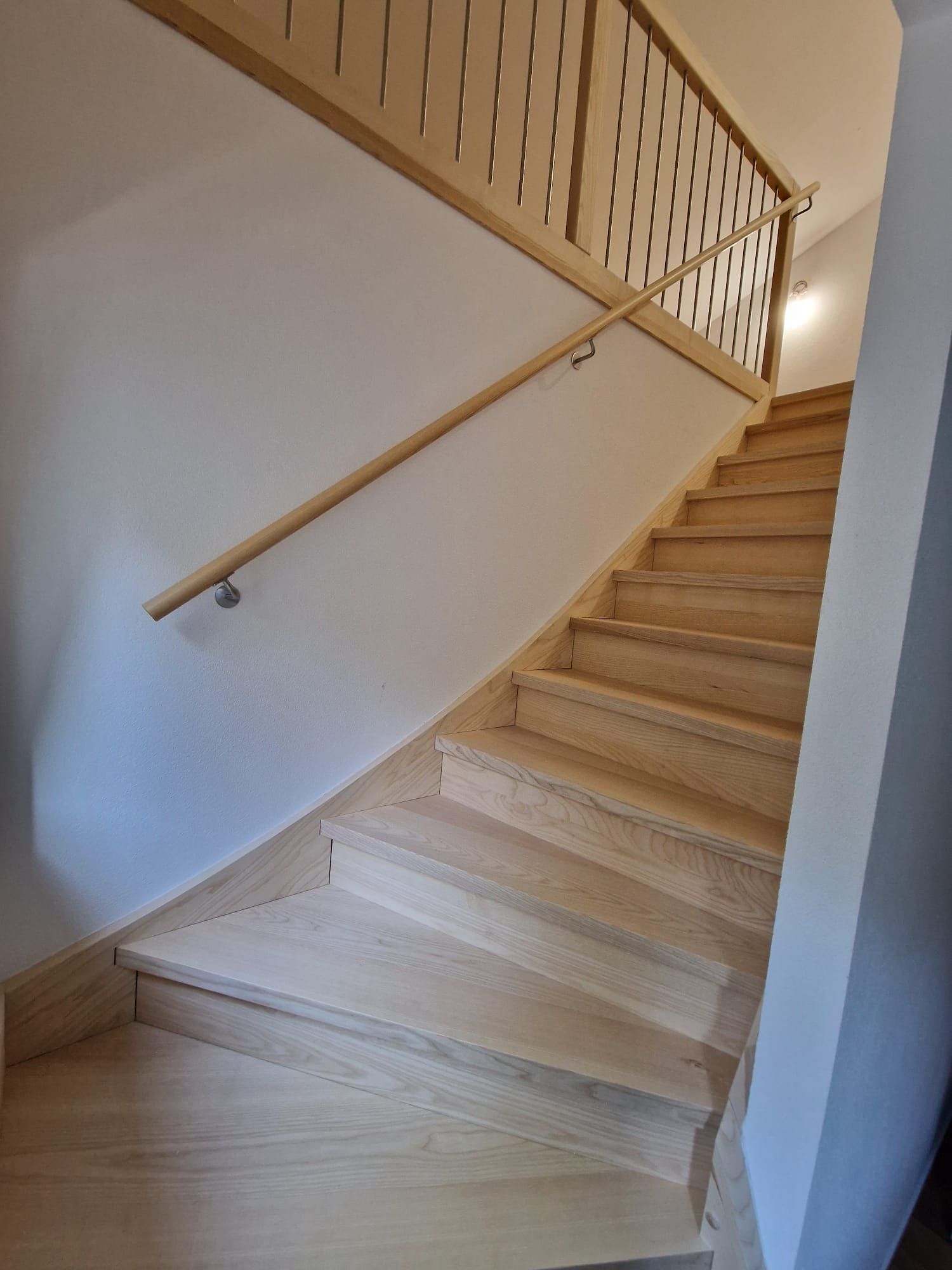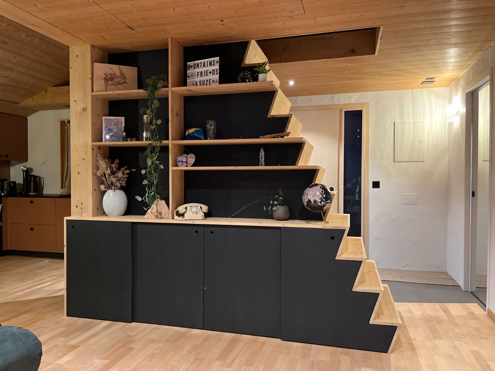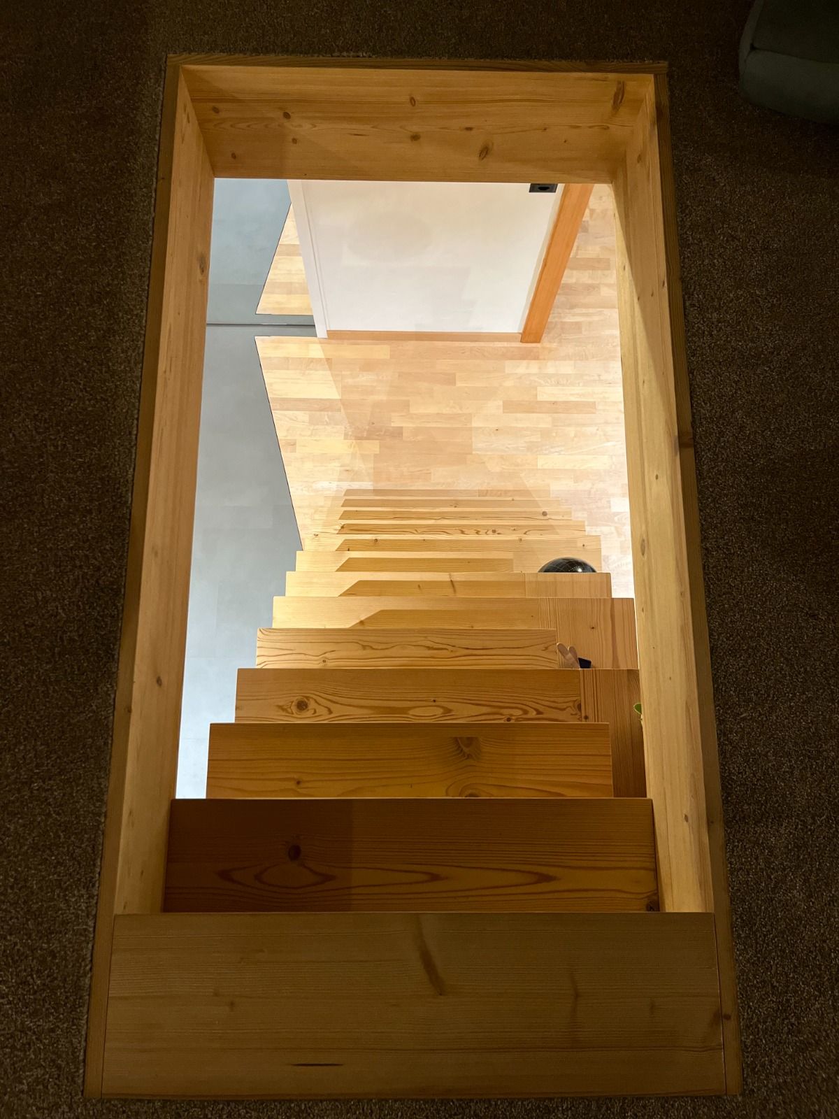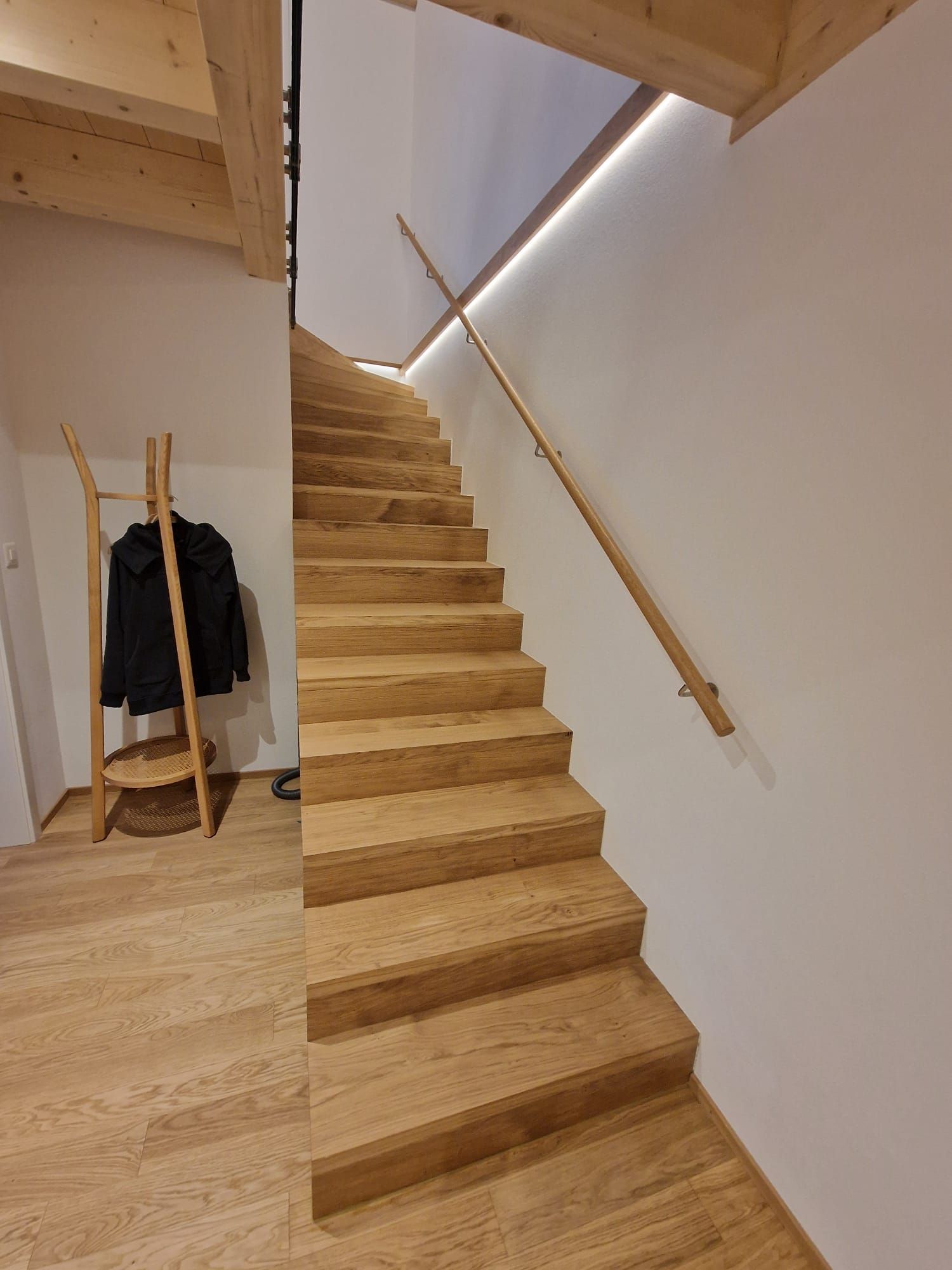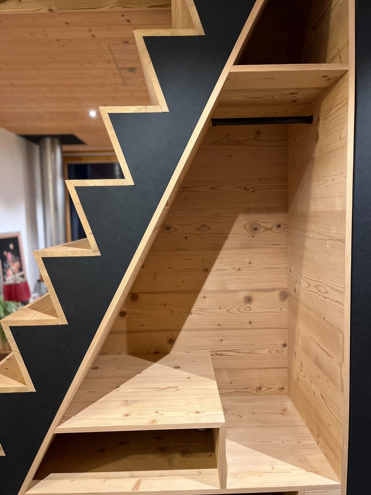 Escalier en vieux bois construit avec le madrier démonté sur place lors de la rénovation